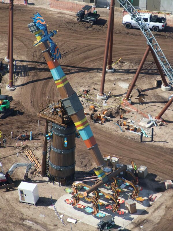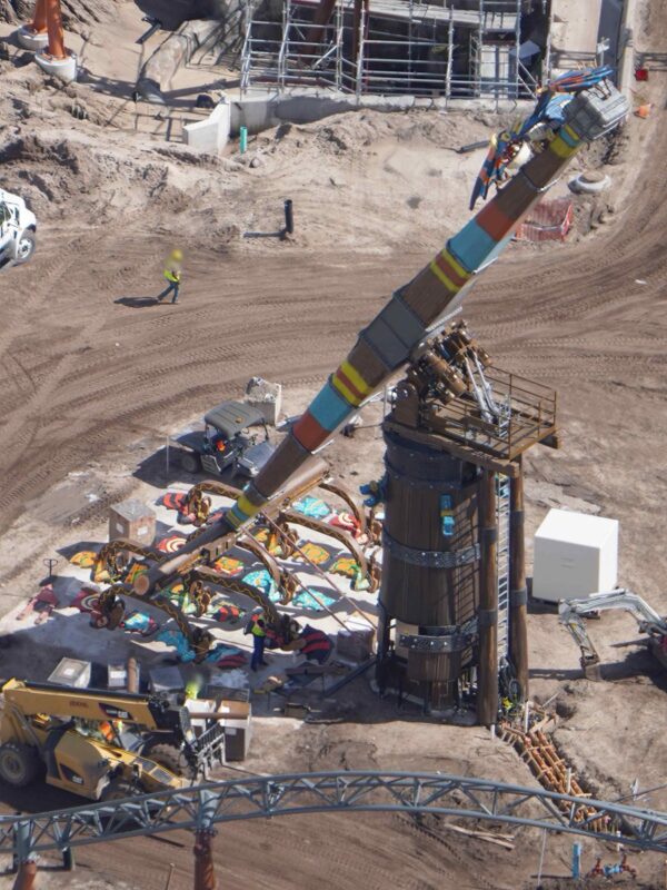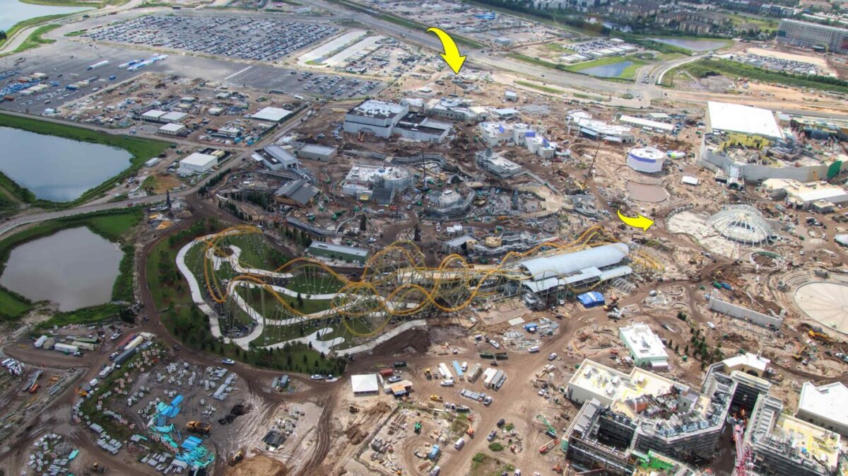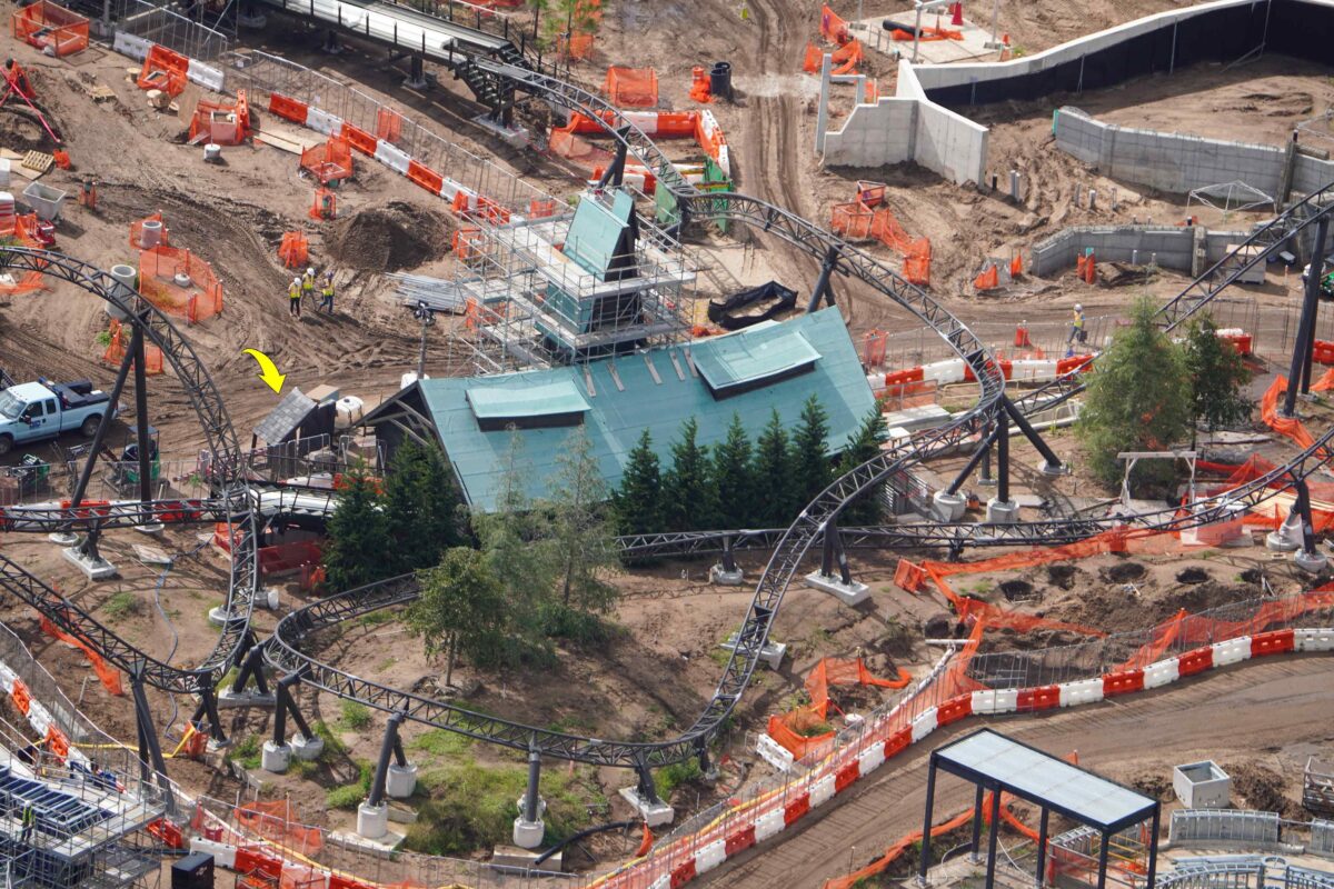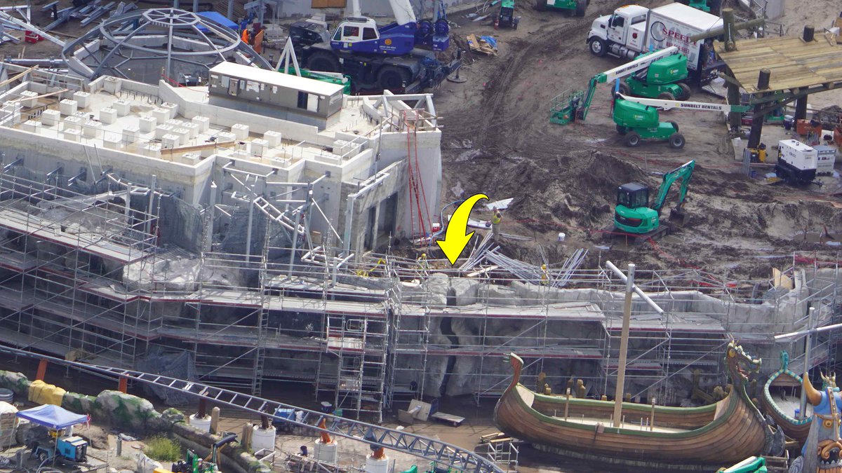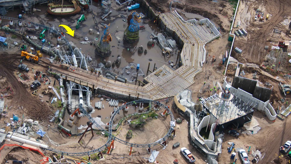 The arrow in this photo points at a curved piece inside the carousel’s water feature, potentially for fountains. To the right is the dual-racing coaster, next to the “How to Train Your Dragon” land.