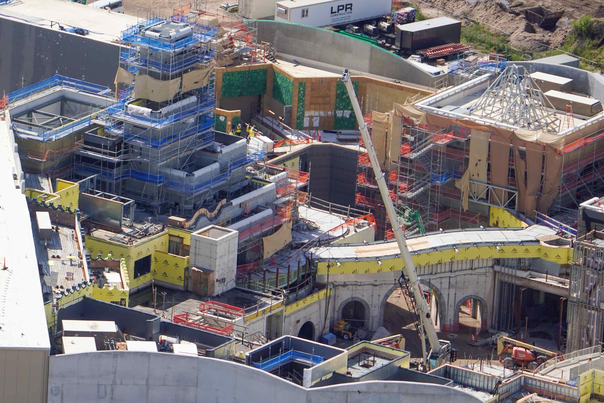 Dark Universe’s roller-coaster is rumored to be called Curse of the Werewolf (another trademarked name). The ride vehicle will reportedly spin. In the approximate center of this photo is the barn-inspired building. Scaffolding surrounds a tower of it.