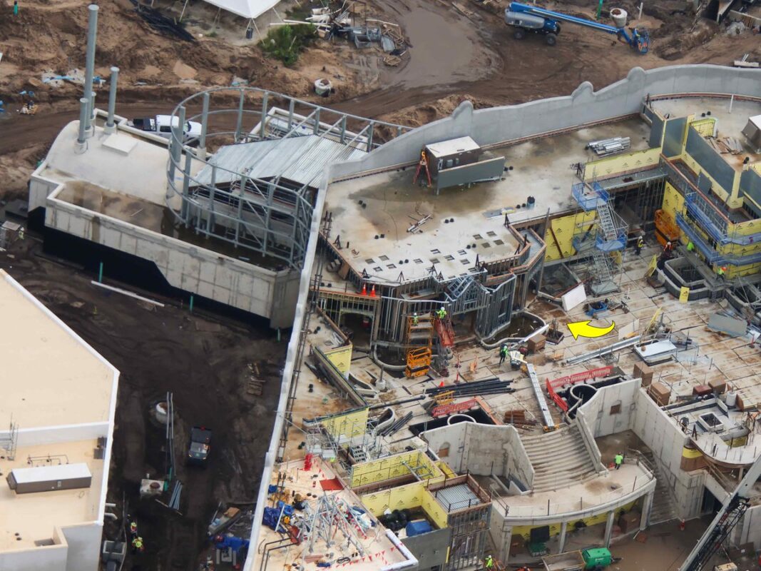 A yellow arrow points at the façade for Peach’s Castle. Steel frames show the castle’s shape. This is where guests will enter.