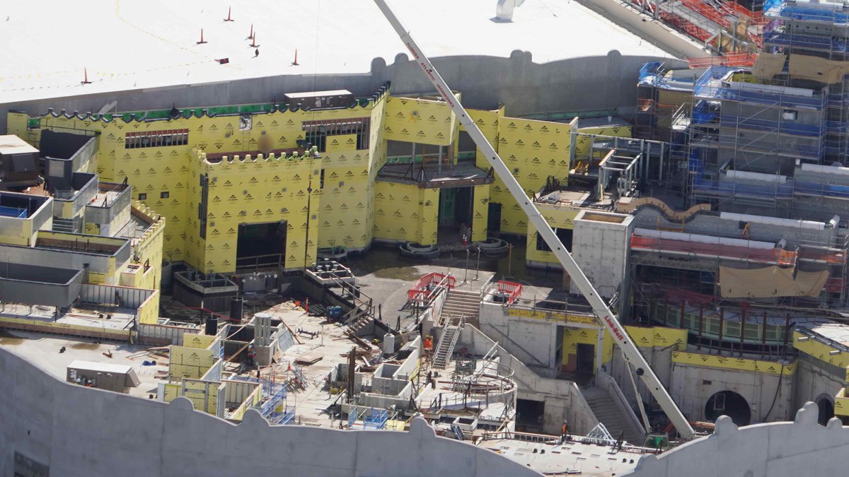 The large show building at the back of the Mushroom Kingdom and next to the Donkey Kong coaster is the show building for Mario Kart. The façade, currently covered in yellow sheathing, will be Bowser’s Castle.