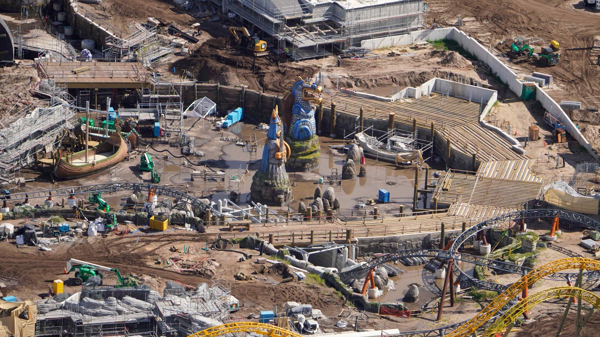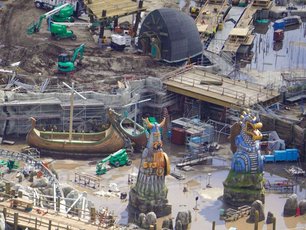 The roller-coaster will go under a bridge of this deck, as seen behind the viking statue in this photo.