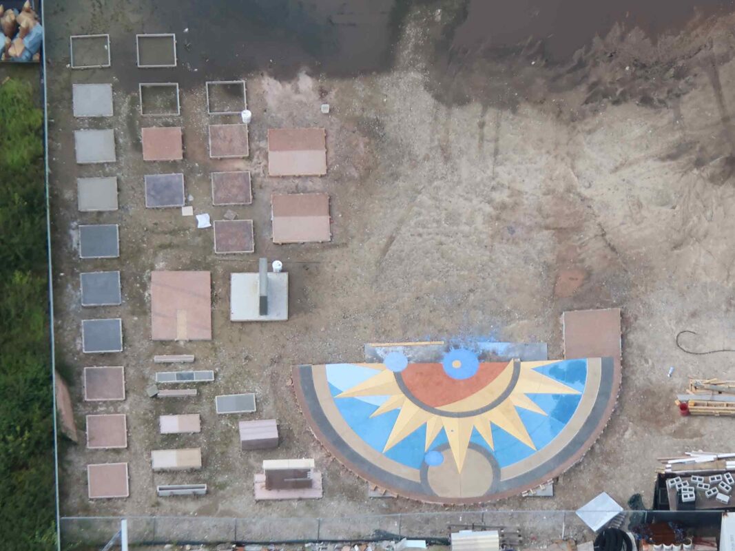 Bioreconstruct also shared this pavement test in a staging area for Epic Universe construction. It shows a half-circle section depicting a sunny against a blue background. There are circles that could represent planets. Such a mural could be on the floor in Celestial Park.