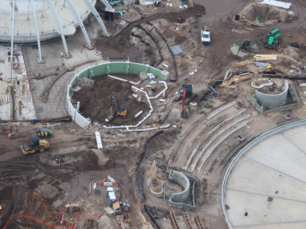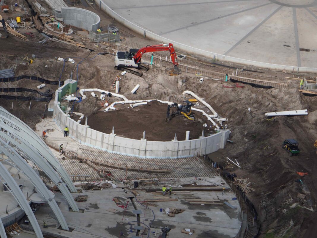 In the excavated area for a water feature are some concrete forms. To the left of this photo is an octagonal building, reportedly for a waterside restaurant.