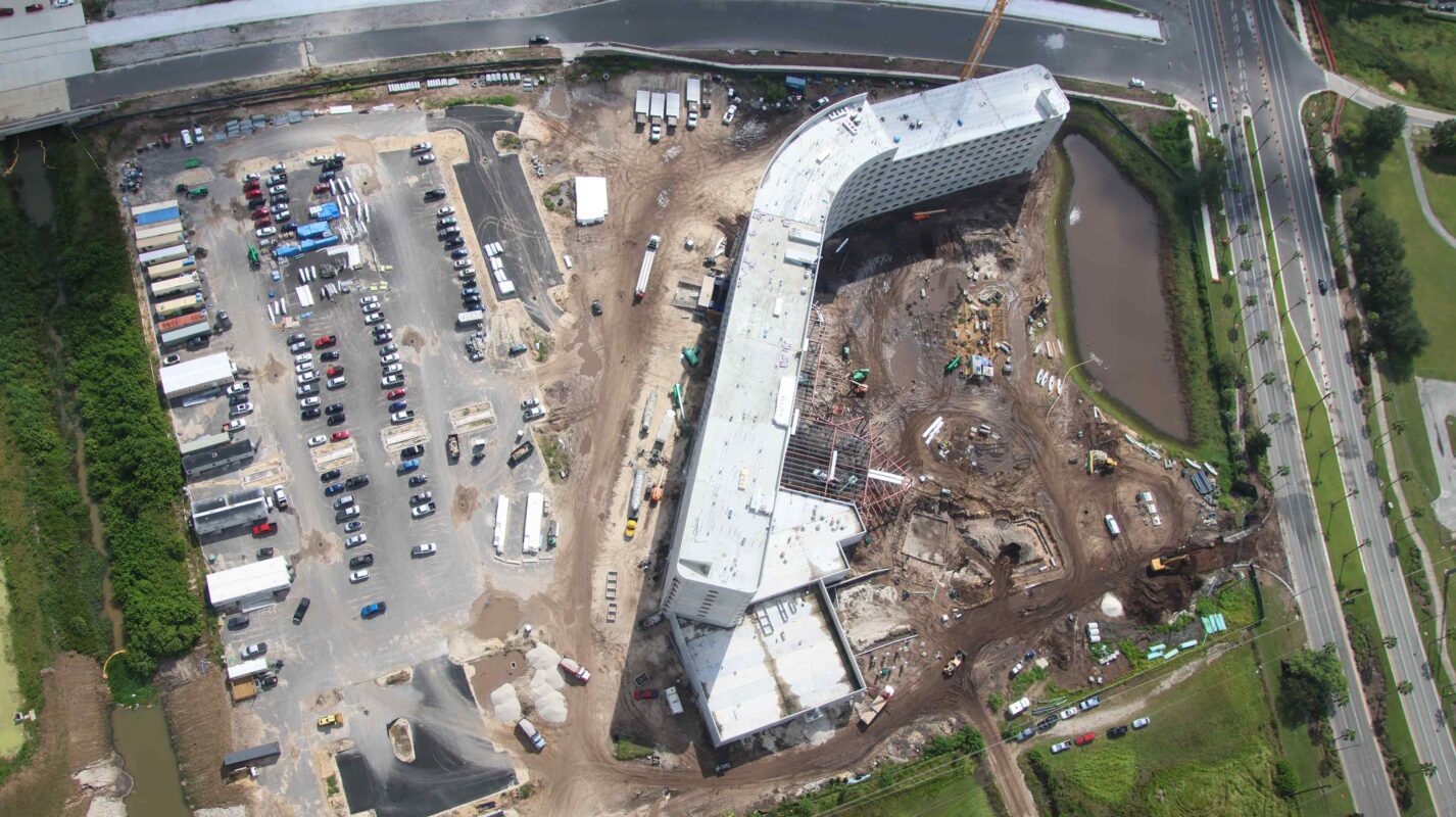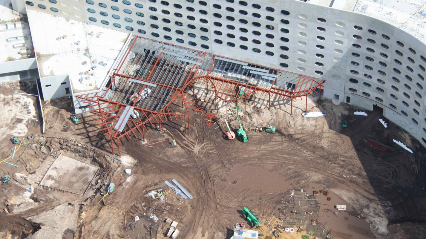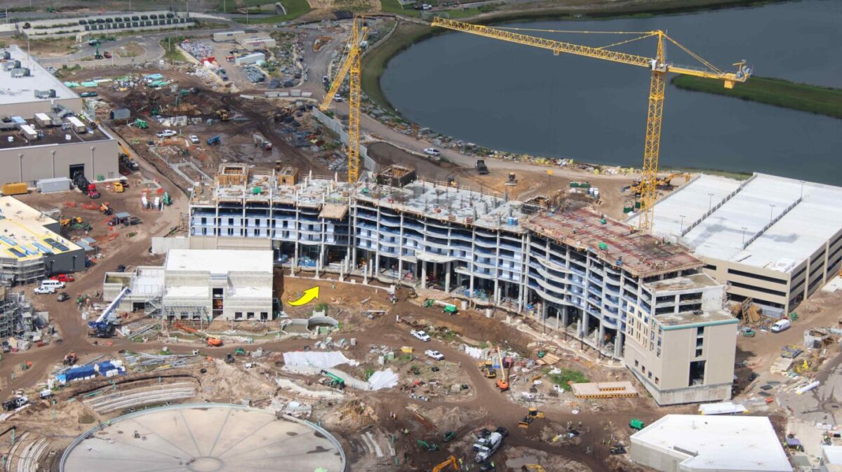 Two cranes tower over the hotel, which is now about eight stories tall at its highest point. An arrow points at columns being cast at ground level.