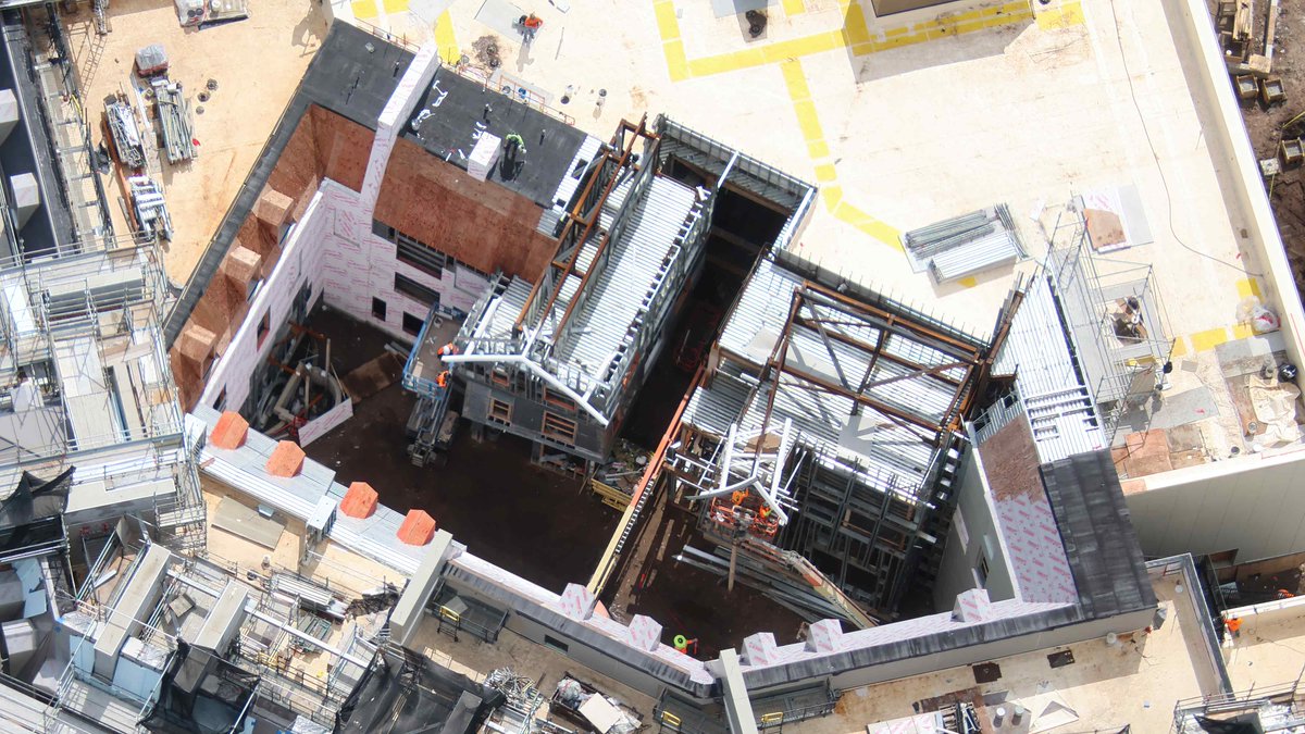 The Great Hall opens into a rectangular building. One of the flat walls already has a rocky steel frame over it. Another small building with a peaked roof is to the left.
