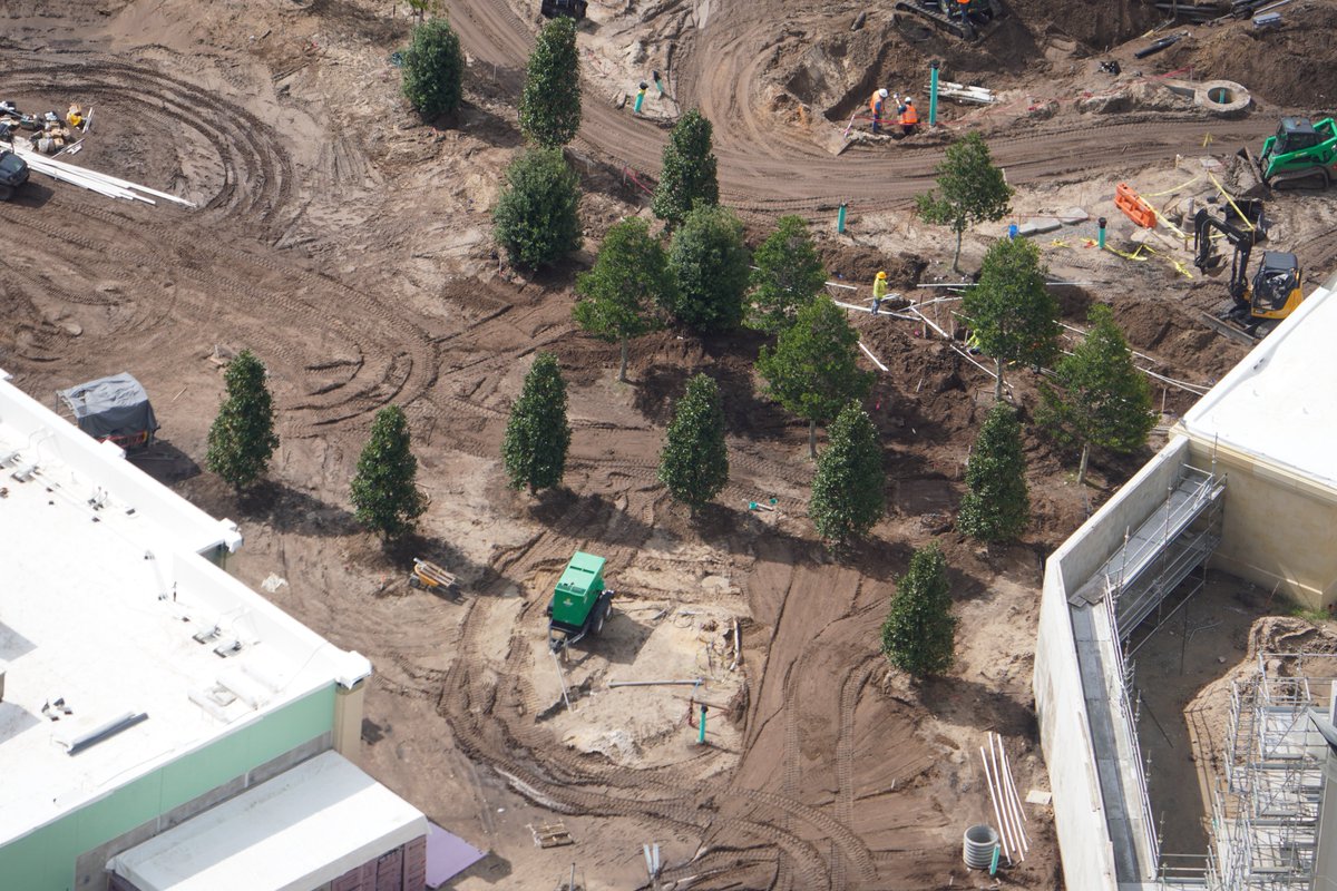 The chainlink fencing implies ride testing may be going on. Landscaping has begun, with a few pine trees planted between the curves of the coaster. There are holes in the ground for more trees.