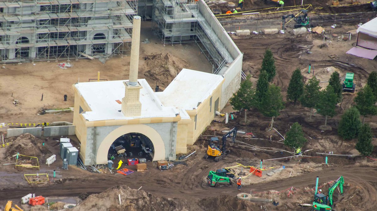 Moving further into Celestial Park — the rumored name for the non-IP central land — this building is rumored to be a barbecue restaurant. Behind it is Dark Universe, the rumored name for a Universal Classic Monsters land.