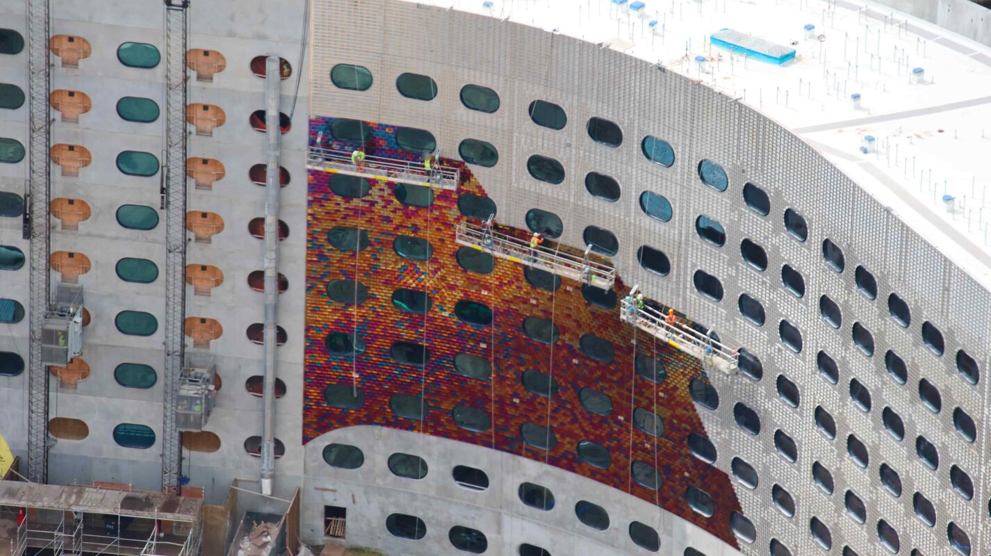The hotels have rounded windows. Crews are installing the tiles that create a glittering mosaic on the exterior walls.