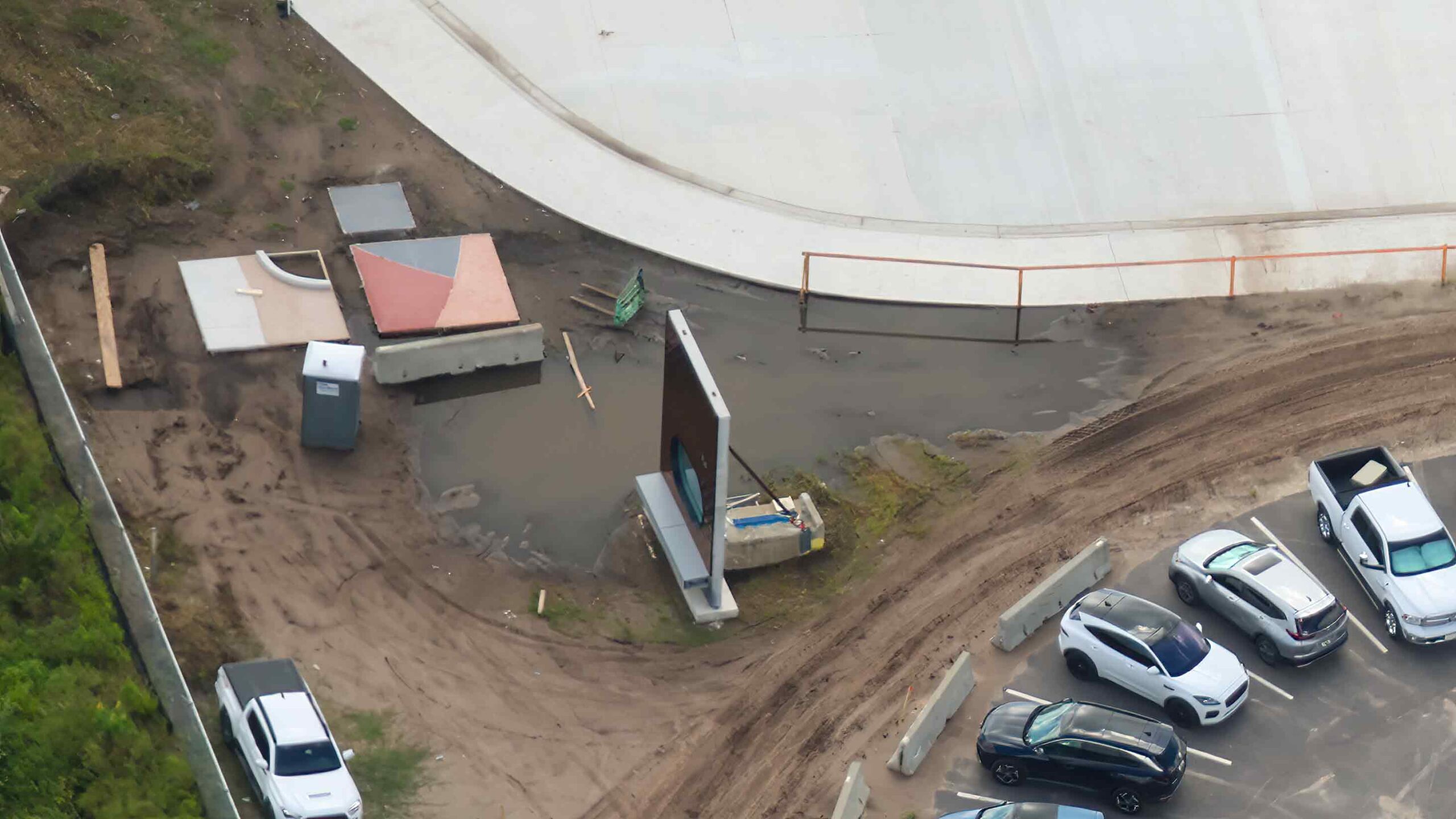 A fence resembling uneven planks of wood is at 1 in this photo, meant to hide the entrance to the coaster’s maintenance bay. At 2 are materials being staged. At 3 are the frames for tents.