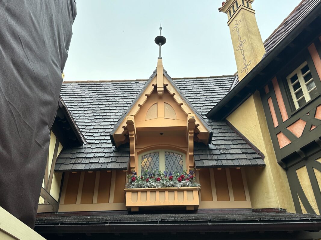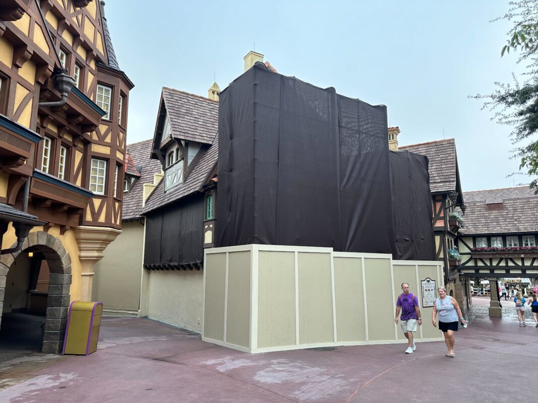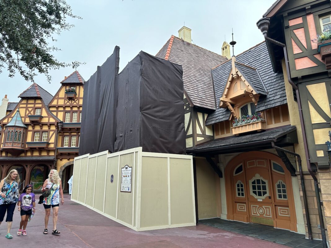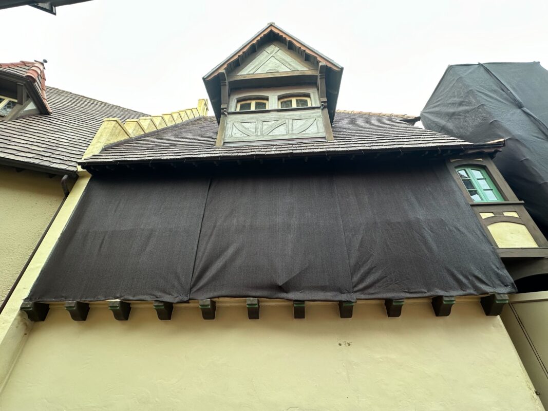 More scrim and scaffolding now cover a section of the Columbia Harbour House façade at Magic Kingdom. About a month ago, we noticed the start of refurbishment work on the side of the façade facing Fantasyland. Then last week, construction walls went up. The quick-service restaurant remains open.