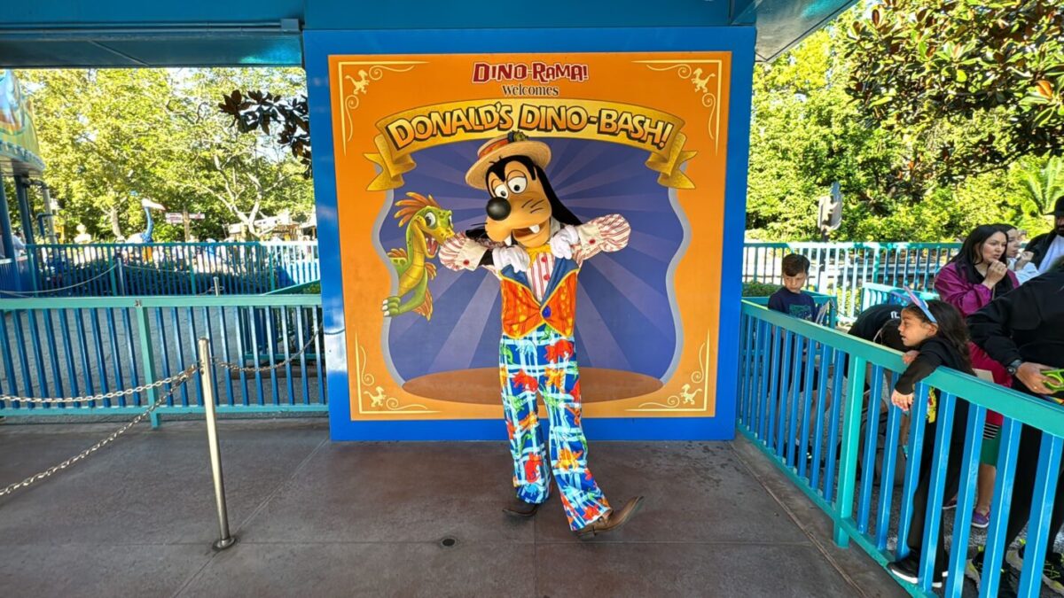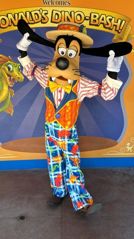 Goofy is meeting next to TriceraTop Spin, in front of a Donald’s Dino-Bash backdrop.