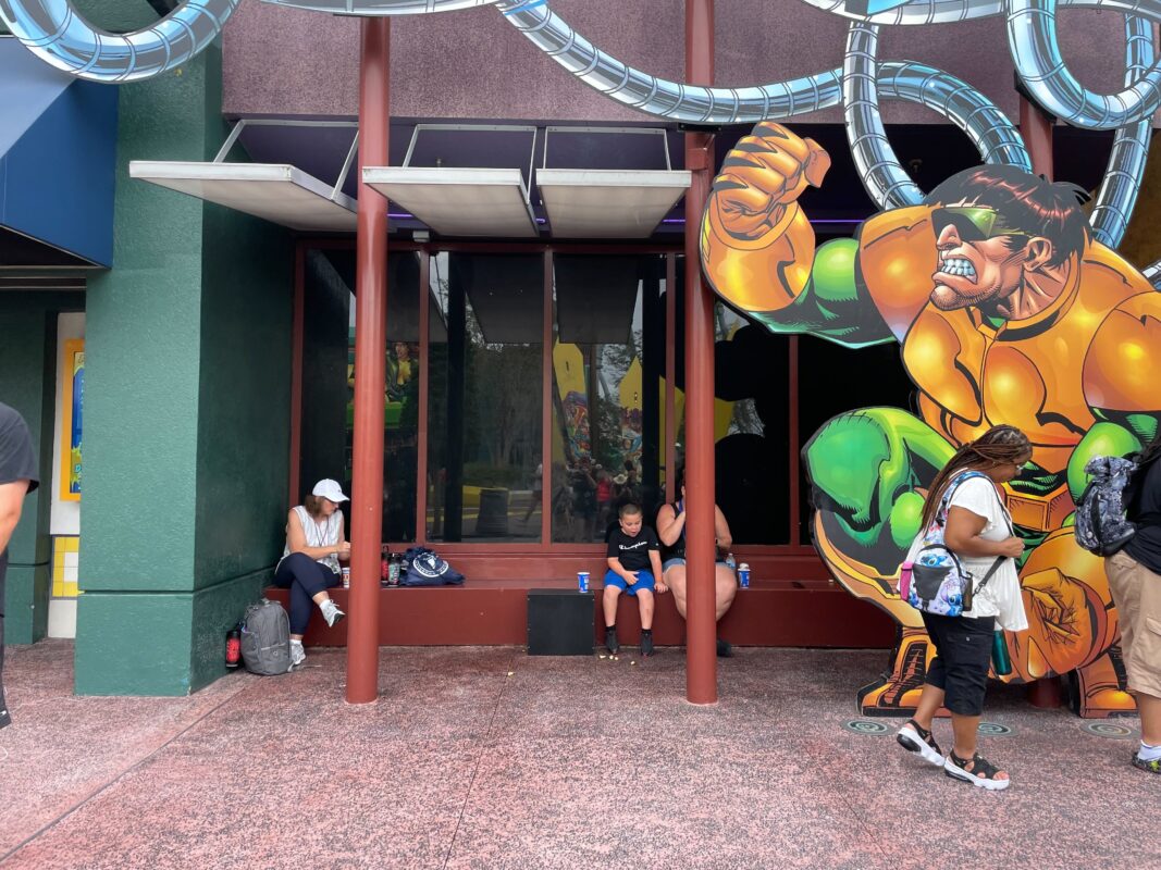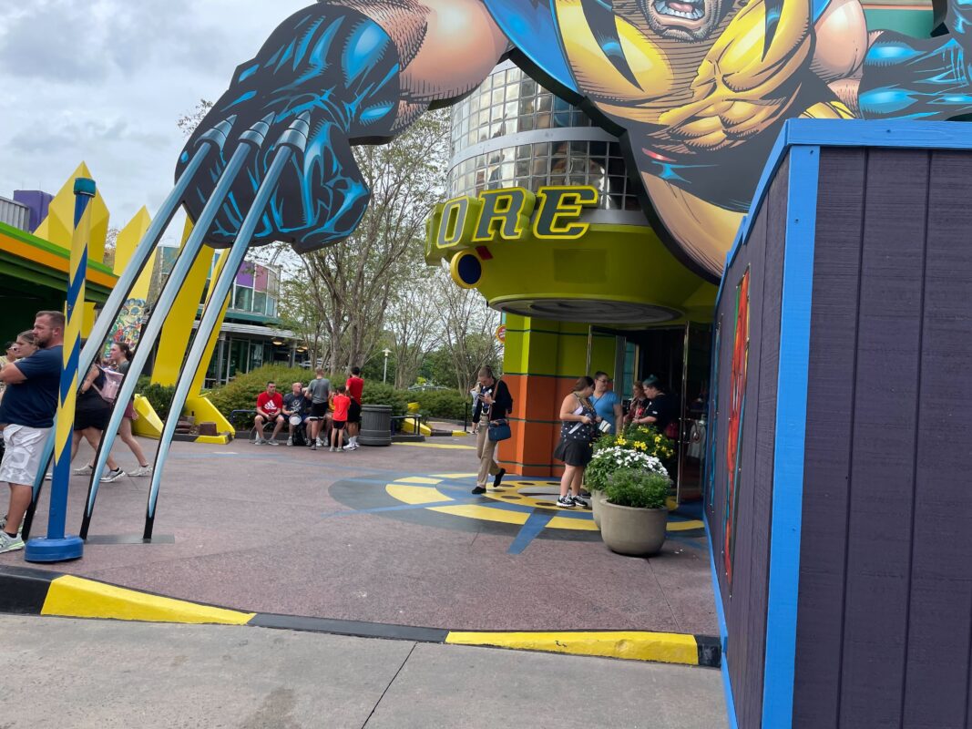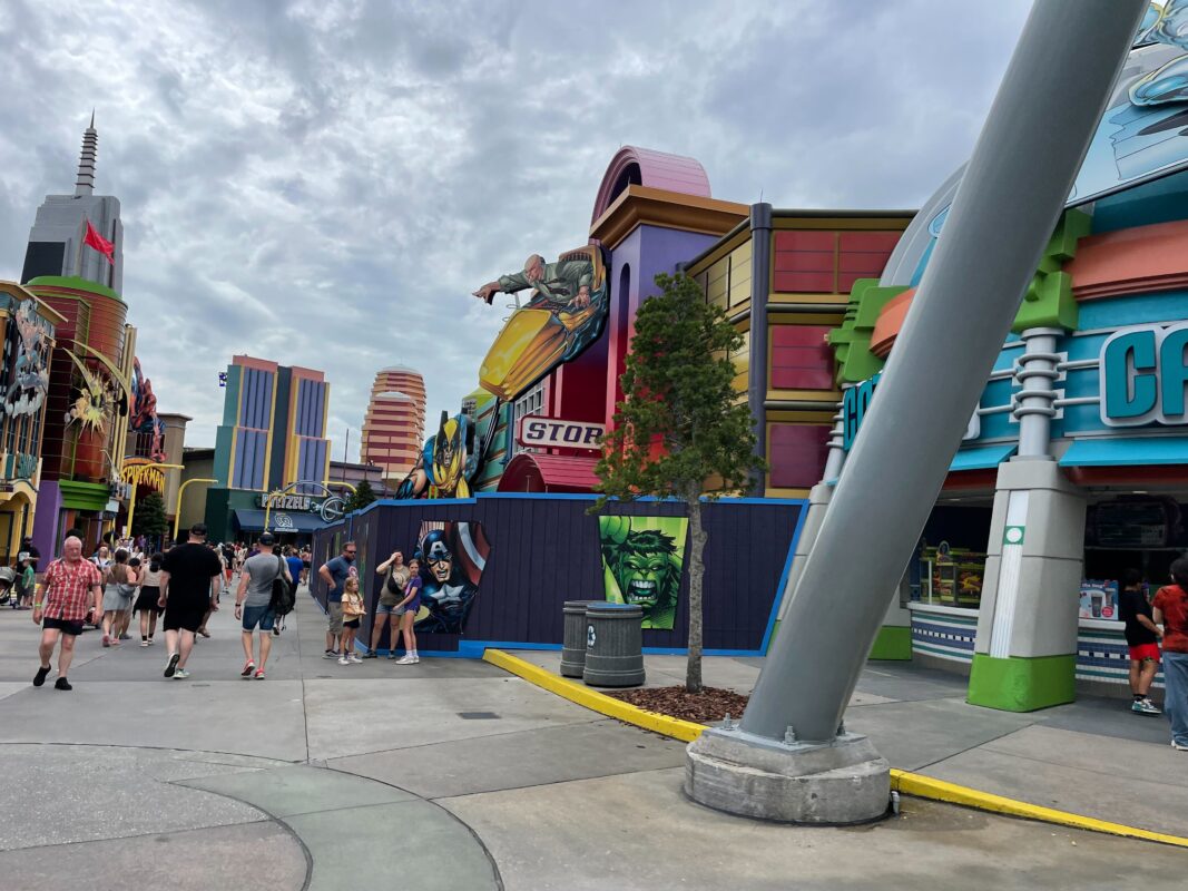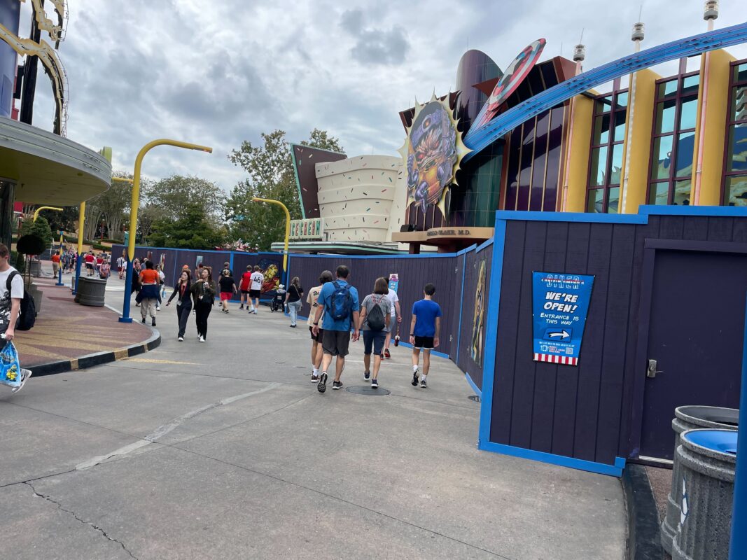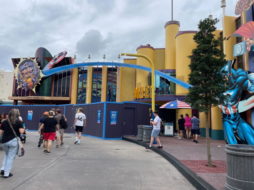 The walls extend around the seating area that is usually available at the end of Marvel Super Hero Island before entering Toon Lagoon.