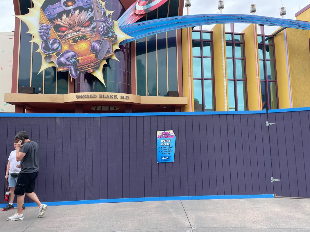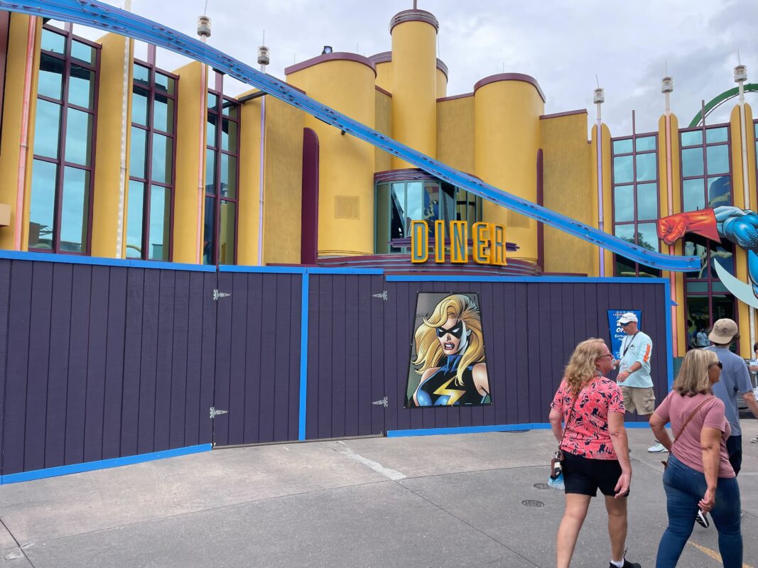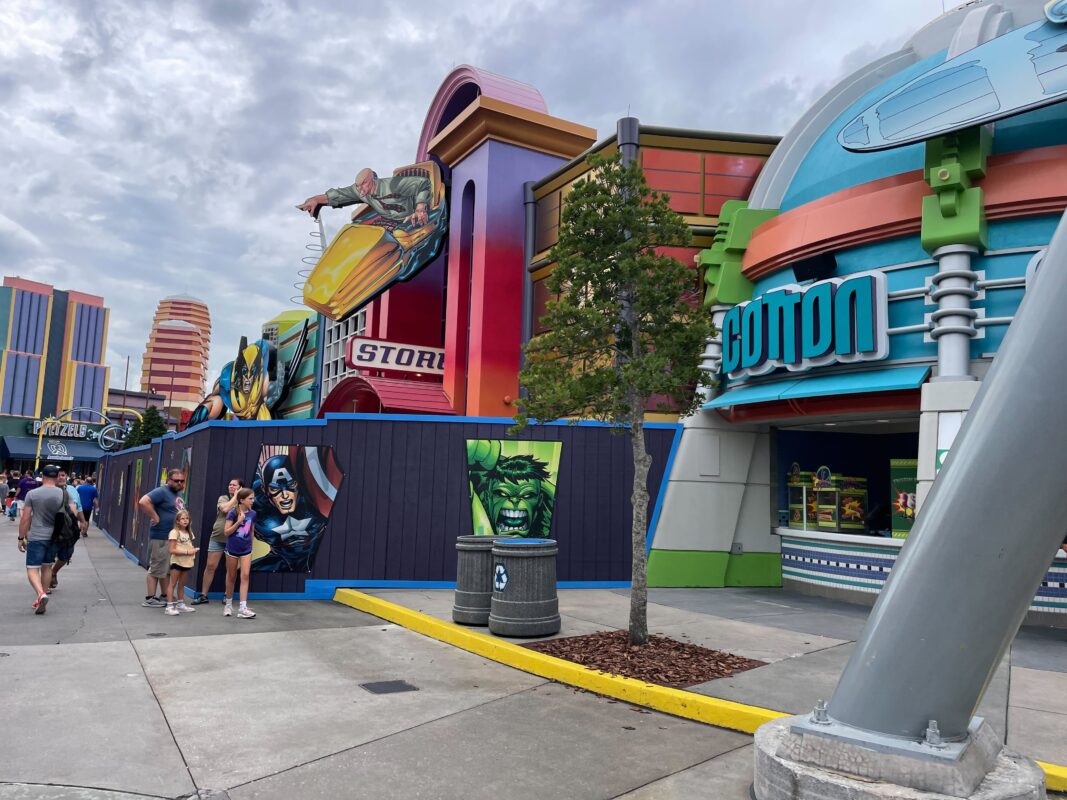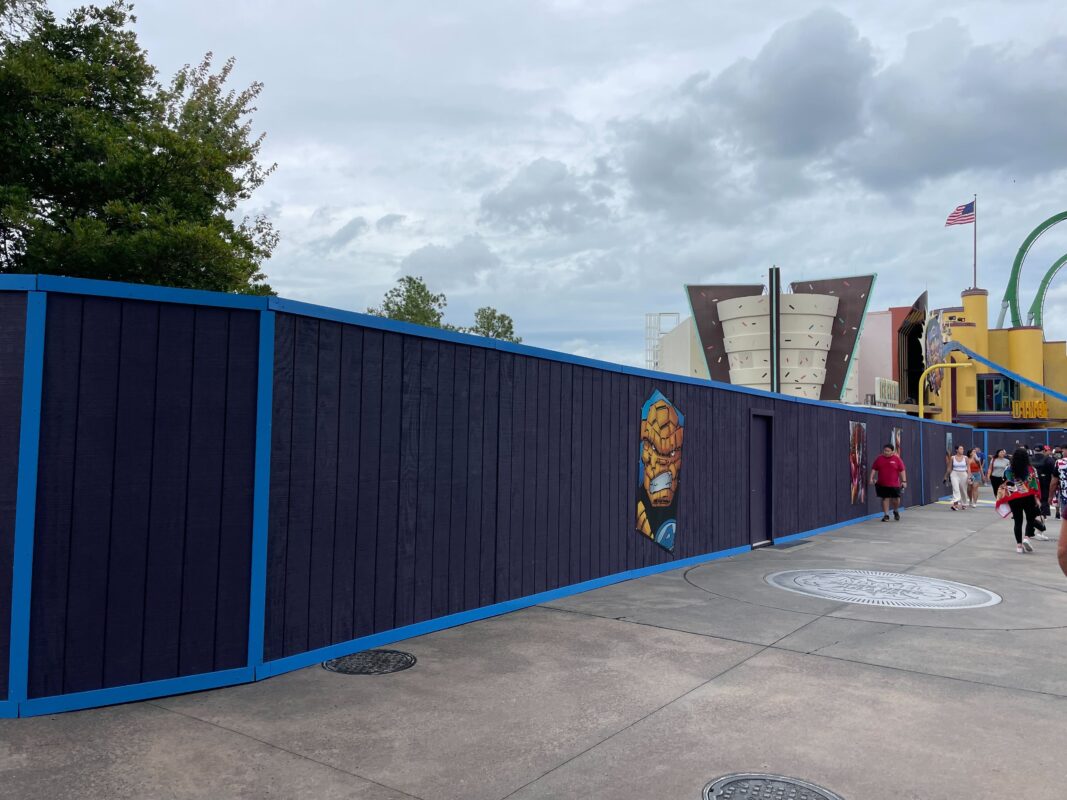 Construction walls have gone up in Marvel Super Hero Island at Universal’s Islands of Adventure for another round of refurbishment work. Last winter, crews repainted much of the land. In the spring, the meteor crash plaza was refurbished, followed by an extension of the Comics Shop. The fruit stand also got a new sign and the J. Jonah Jameson statue returned after several years.