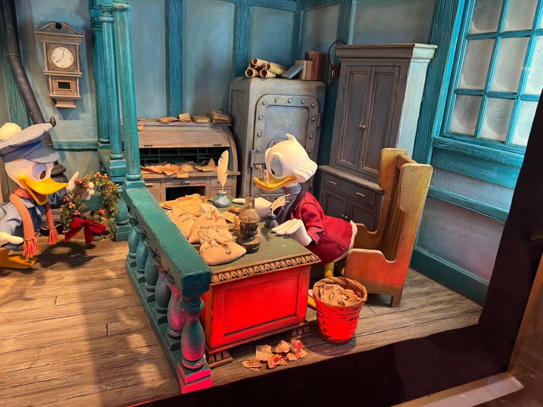 The first diorama aptly depicts one of the first scenes from the animated film. Fred (Donald) enters the room with a wreath in hand as Bob Cratchit (Mickey) sits at a desk with a quill.