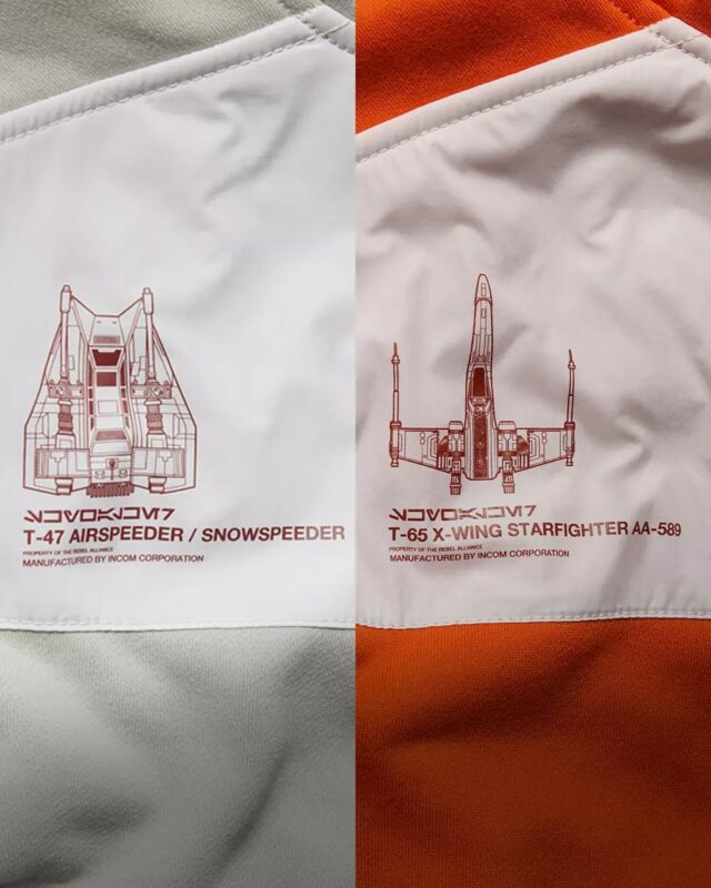 The orange pullover features a printed graphic of the T-65 X-wing Starfighter while the white one features the T-47 Airspeeder/Snow Speeder.