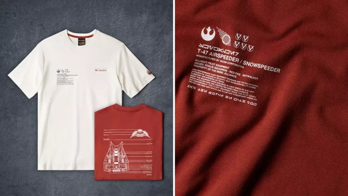 The short-sleeve shirt is made of heavyweight cotton-blend fabric and comes in men’s sizes XXS – 6X. The white version features graphics for the T-65 X-wing Starfighter, while the burgundy red version features the T-47 Airspeeder/Snow Speeder. Both have raised silicone Rebel and Columbia logo patches.