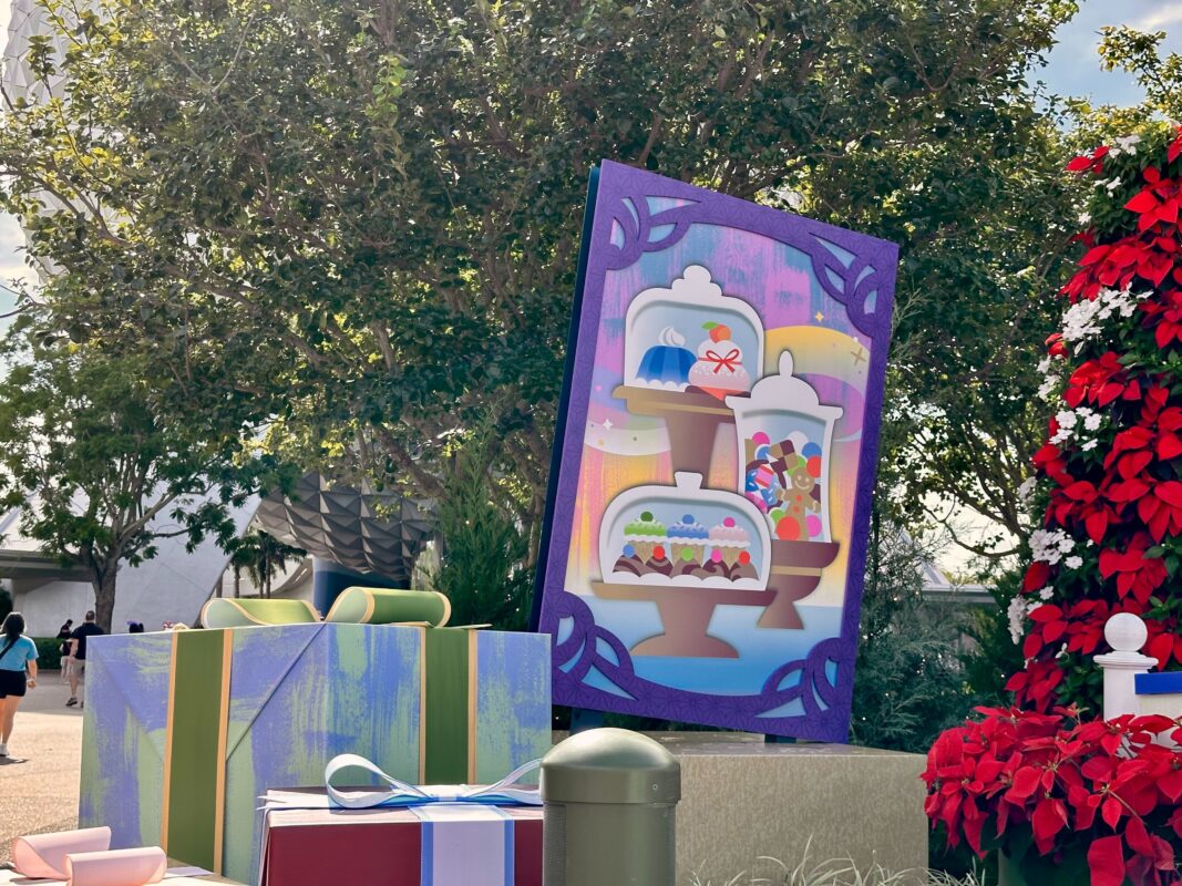 A few days before the 2023 EPCOT International Festival of the Holidays begins, crews have installed the festival’s sign and decorations at the park’s entrance in World Celebration.