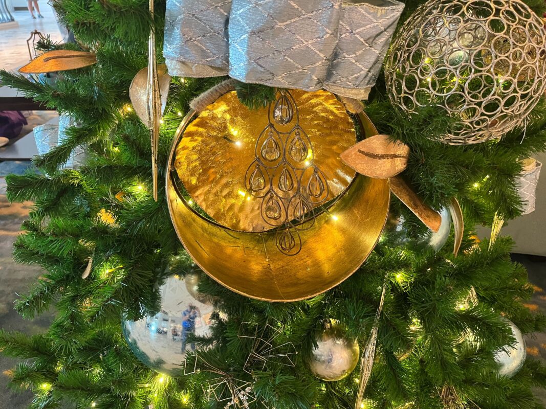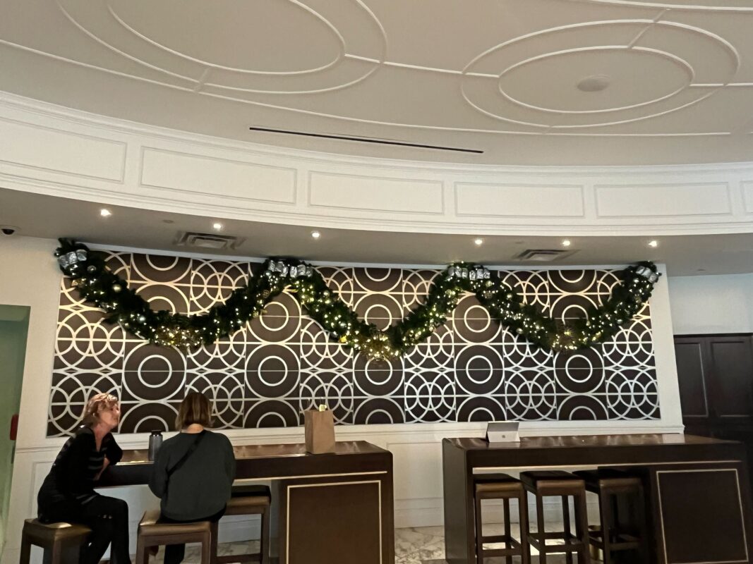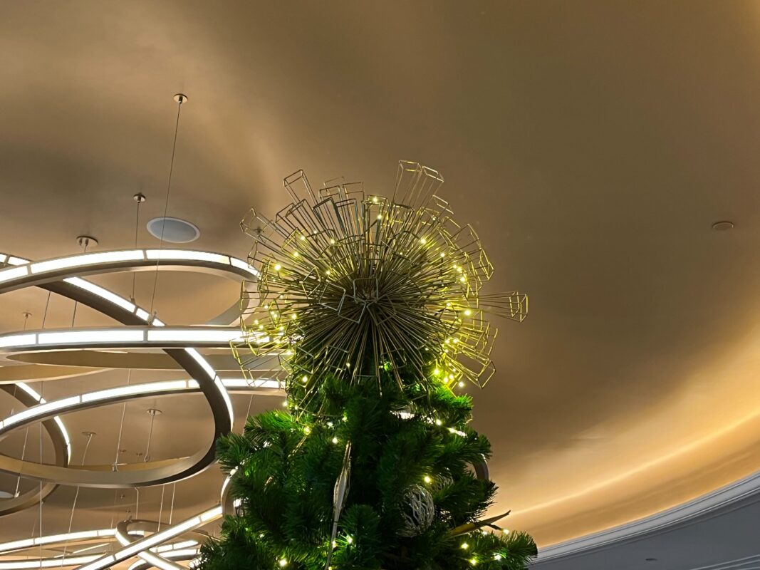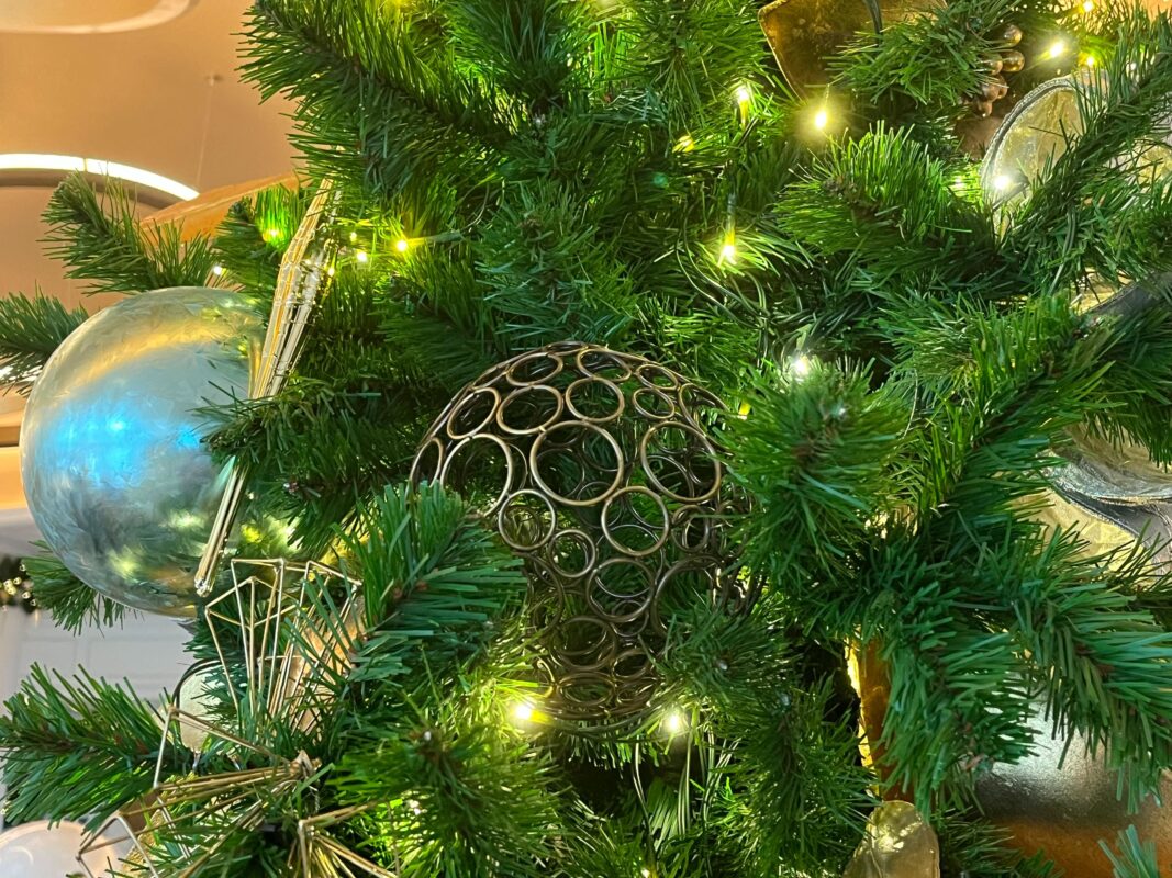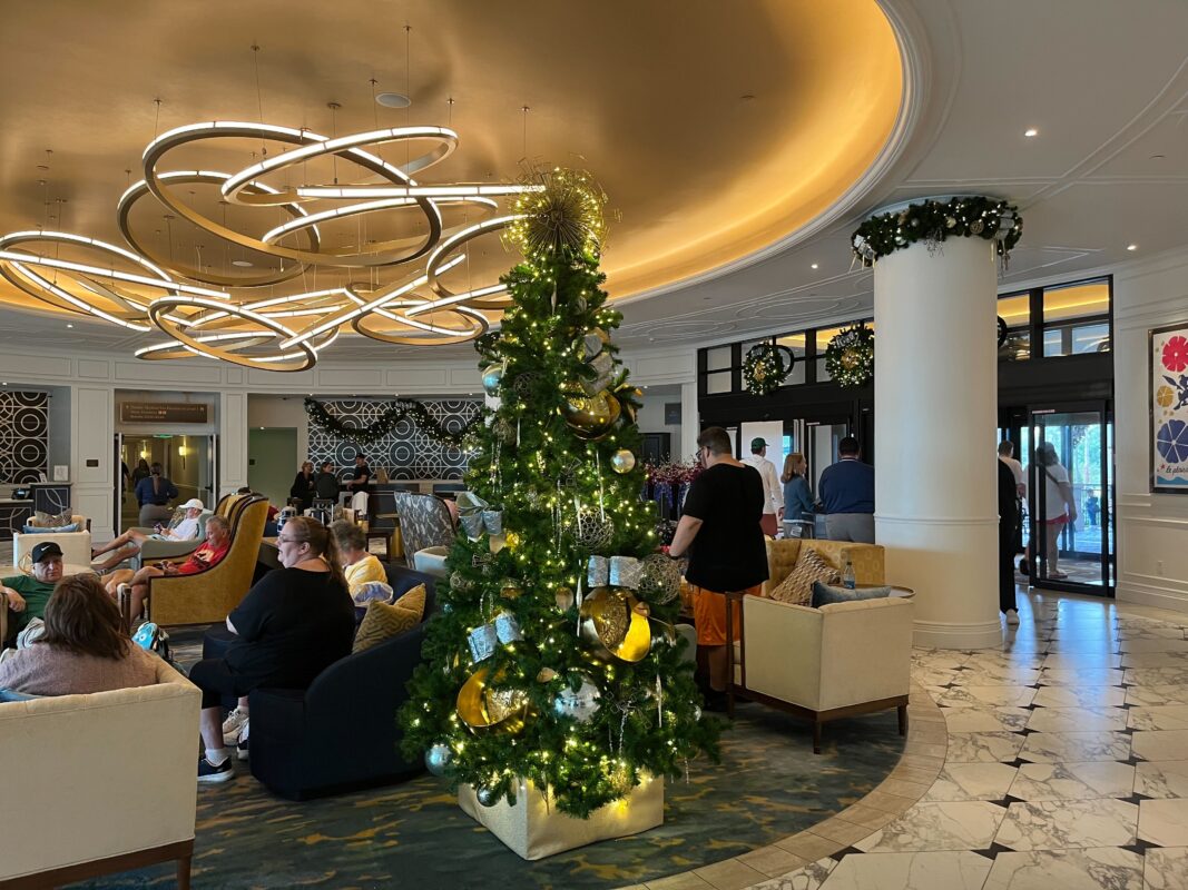 In the lobby is a small Christmas tree with golden lights and ornaments.