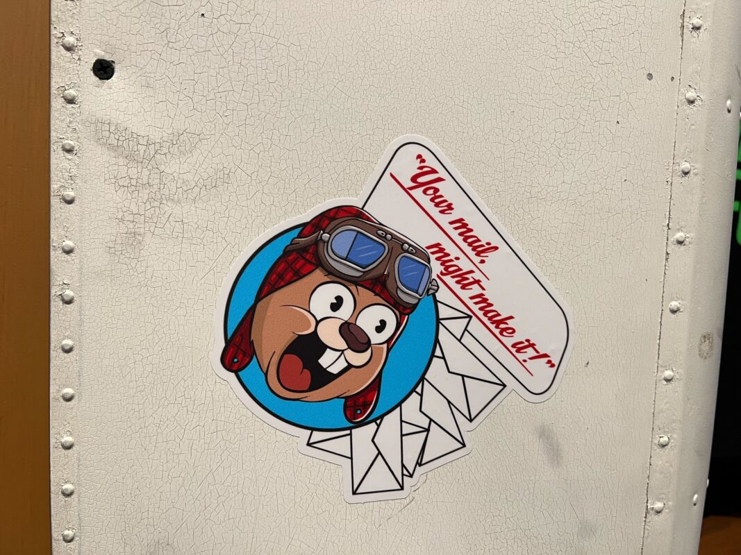 “Right this way!” “Open 4 Bizniz!” signs direct guests towards the entrance to the store. The “Universal Studios” logo has been modified with an acorn with wings in the center. The plane circling the acorn is piloted by Earl the Squirrel and Gerg the Llama.