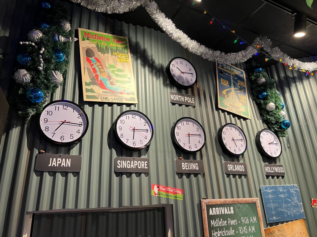 You’ll notice clocks on the wall labeled for Japan, Singapore, Beijing, Orlando, and Hollywood — each of these is a Universal Studios theme park location. There’s also a clock for the time in the North Pole.