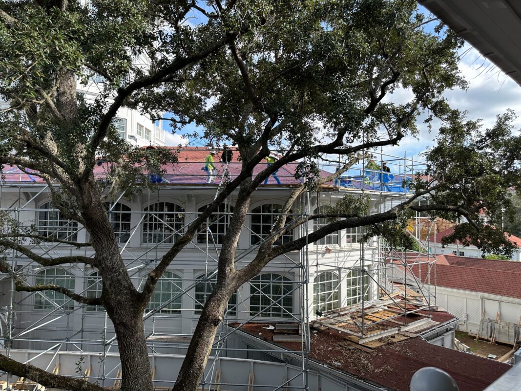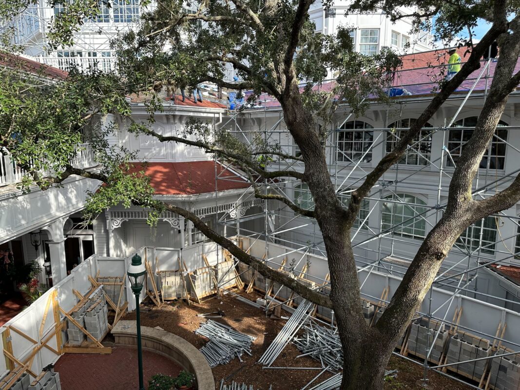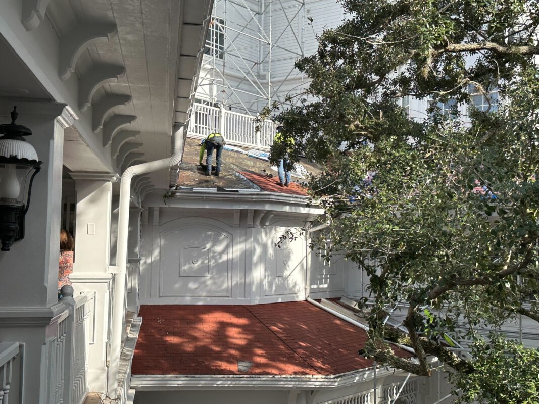 Though the hotel’s Victorian façade is no longer the maze of scaffolding that it was over the summer, exterior refurbishment work remains ongoing at Disney’s Grand Floridian Resort & Spa. We noticed additional work taking place on portions of the roof and moved exterior construction walls during a recent trip to the Magic Kingdom area lodging.