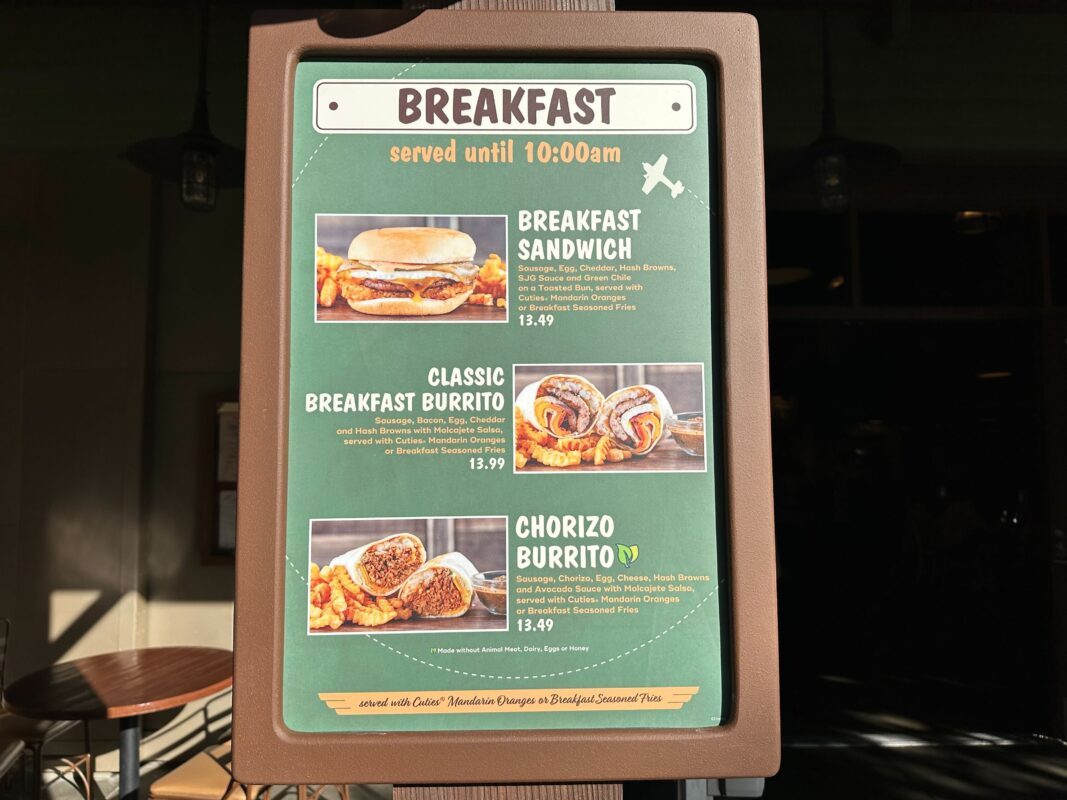 The entrees include a breakfast sandwich, a classic breakfast burrito, and a plant-based chorizo burrito. There are also kids’ meals, sides, and special beverages.