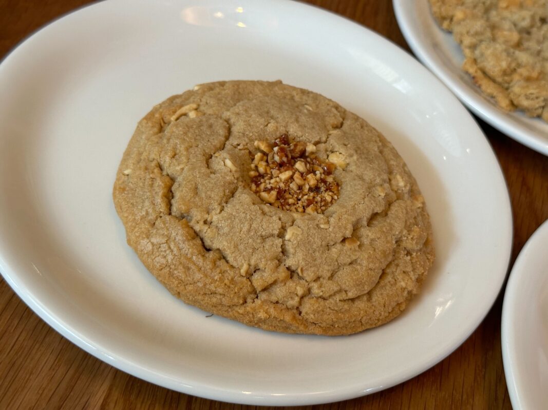 There’s a divot in the center of this cookie that holds peanut brittle.