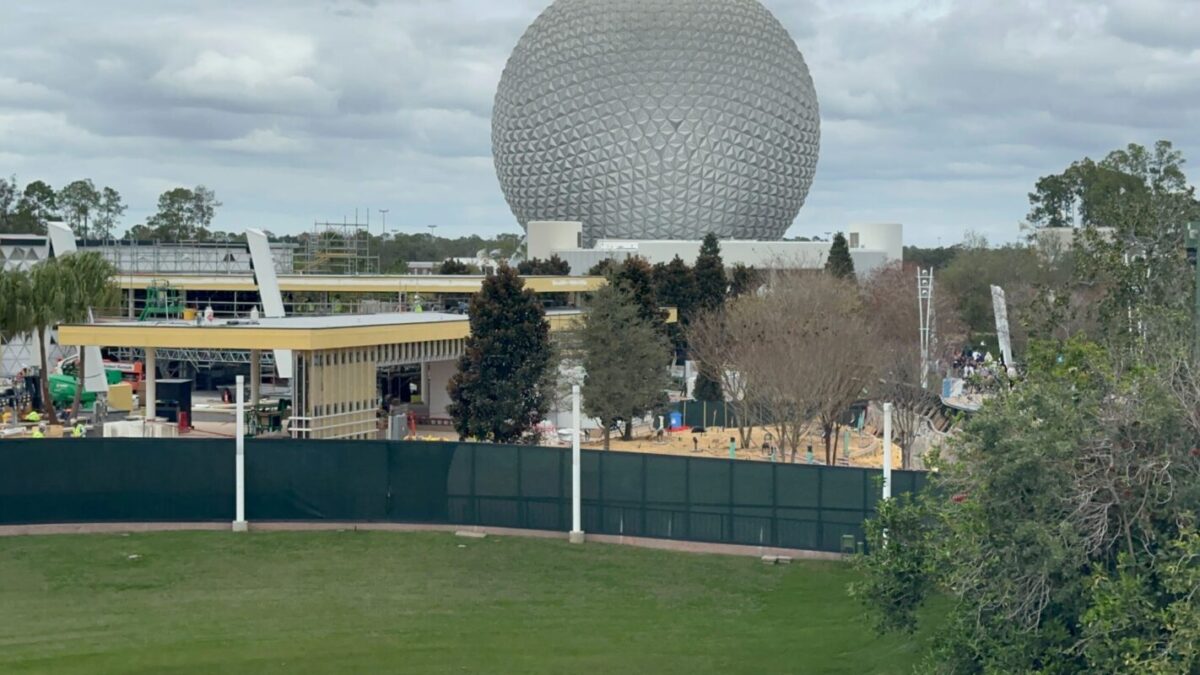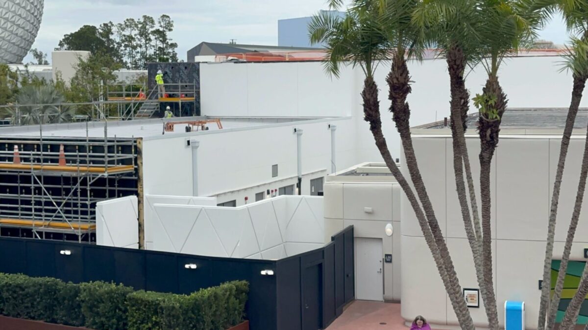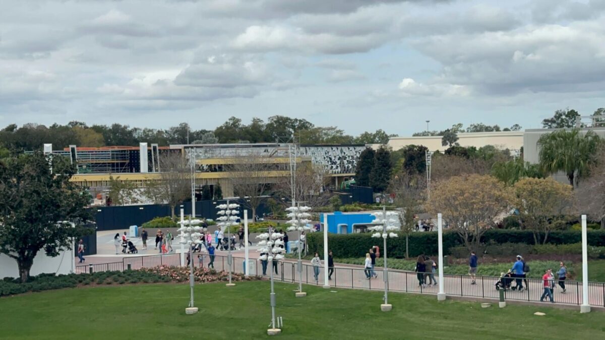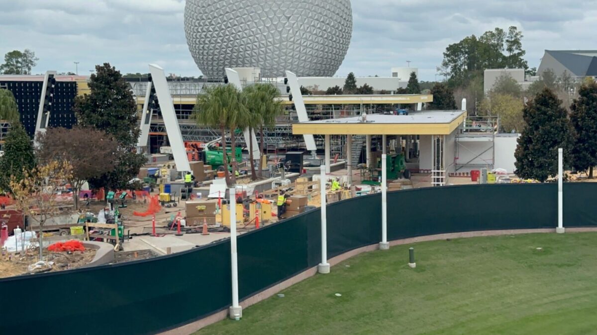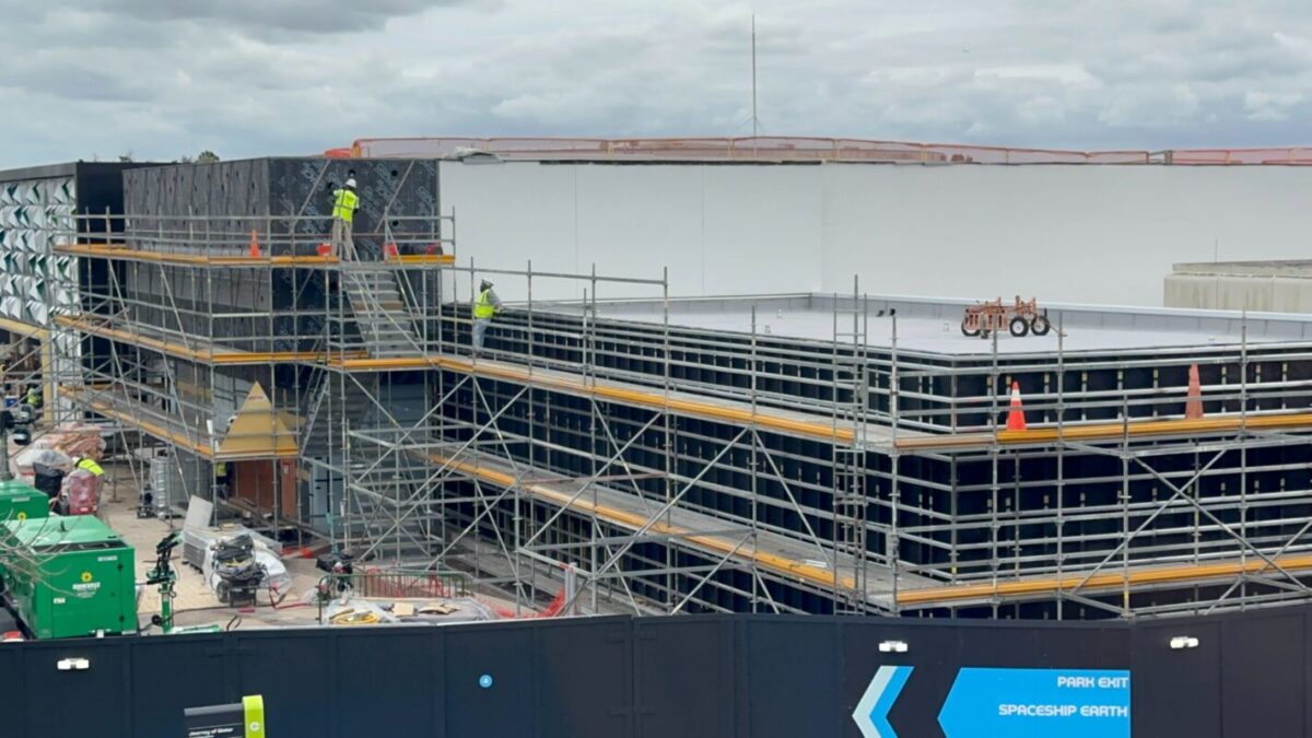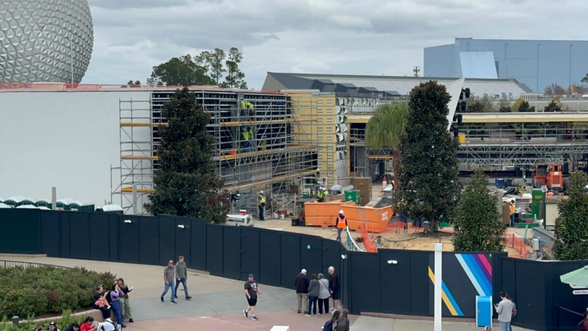 Crews are working on the pavement around CommuniCore Hall and Plaza, as well as on the new building’s walls. CommuniCore Hall is part of the years-long reimagining of EPCOT.