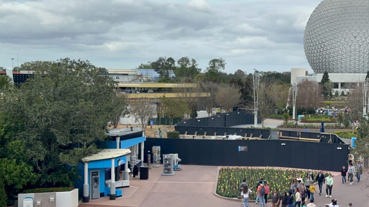 Construction walls currently jut out into the sidewalk between World Celebration Gardens and the World Showcase bridge, although there is a gap that guests can walk around. Behind the walls, the pavement has been torn up to be replaced.