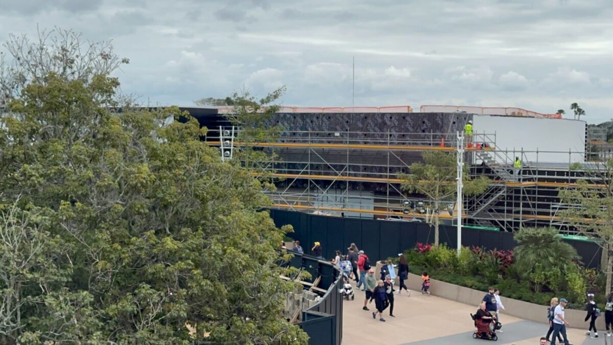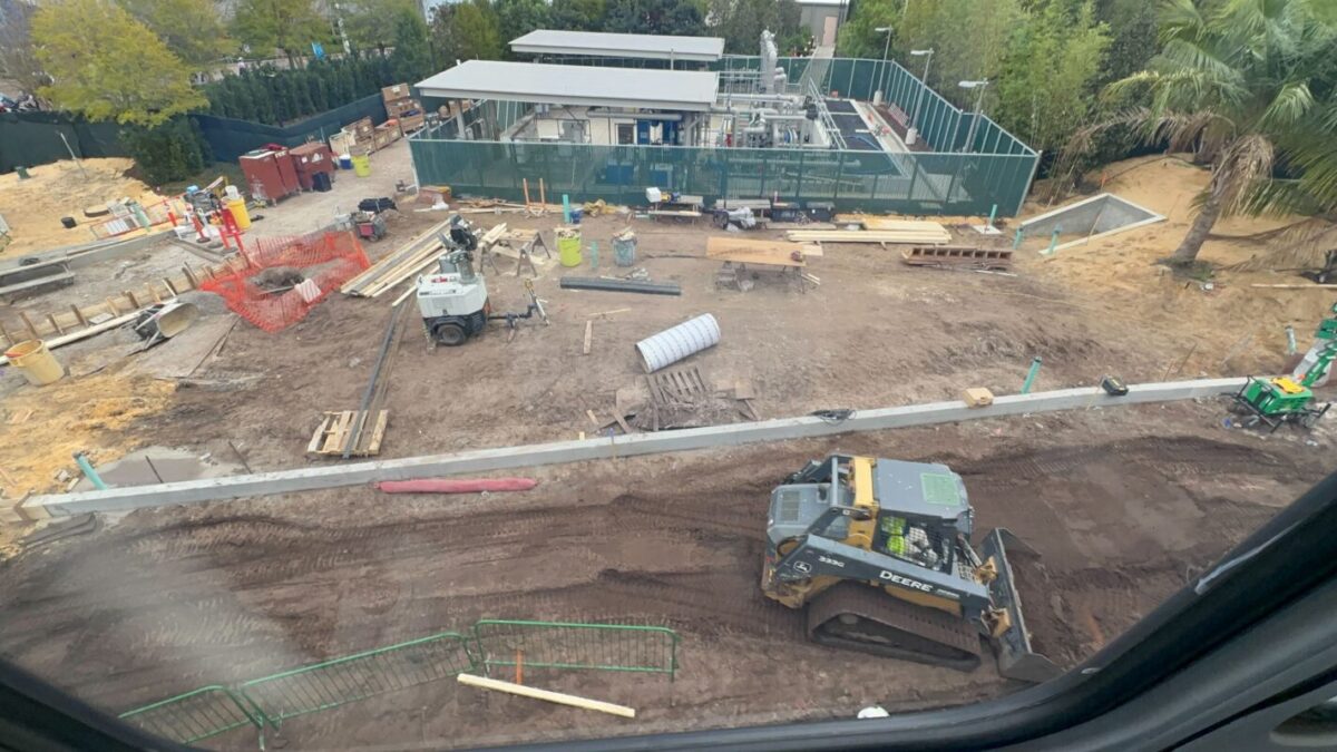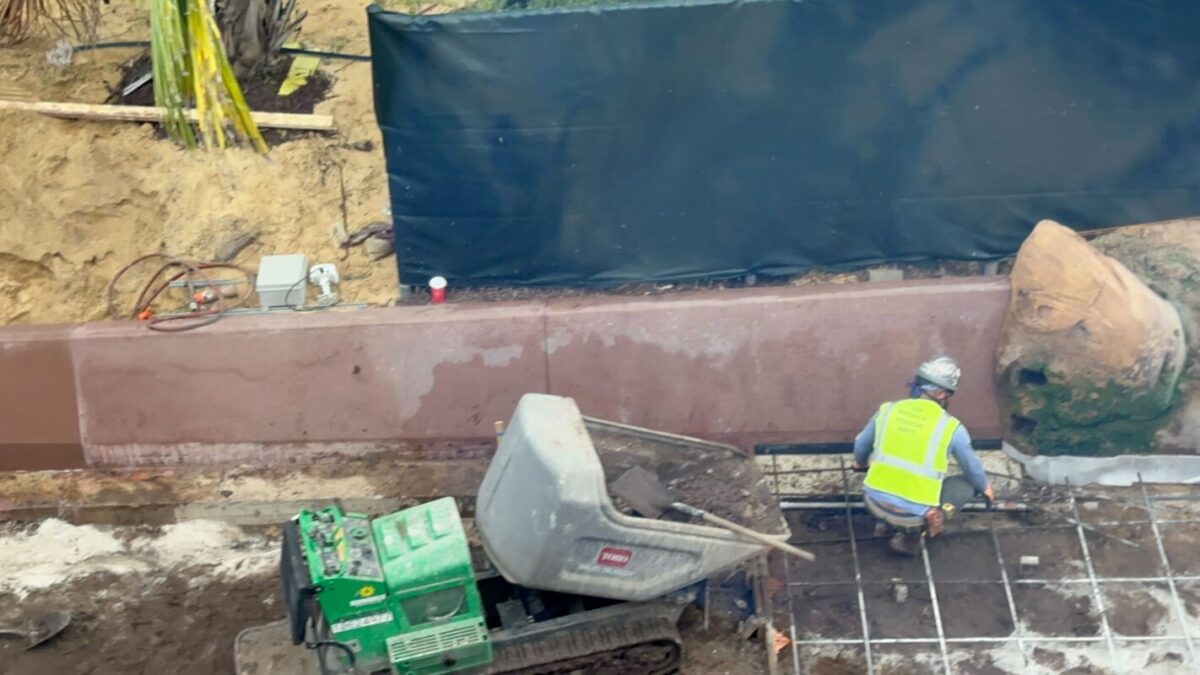Though Journey of Water is open, work also continues around the attraction’s water station. A short concrete wall runs between the water station and the construction walls. The water station is hidden from view on the ground by palm trees and other elements that match Journey of Water.