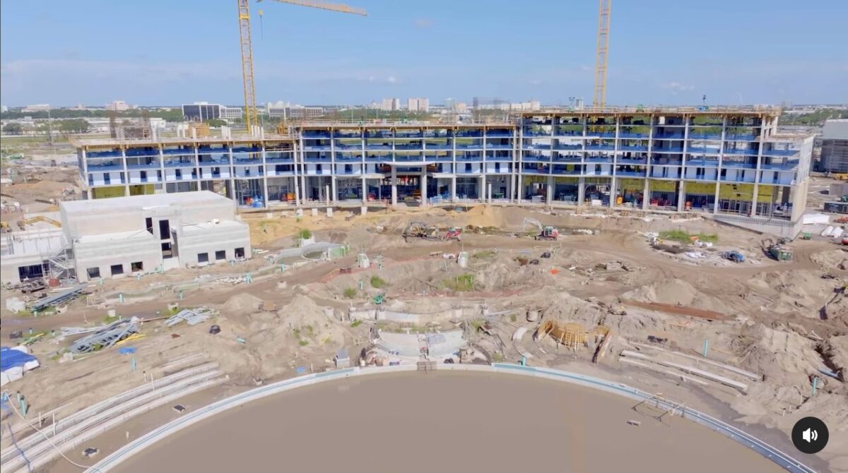 This is a clearer view of the in-park hotel, much earlier on in the Epic Universe construction phase than it is currently, as there are only a few stories. The circle at the bottom of the screenshot is the base of a fountain, while the structure to the left is rumored to be a restaurant.