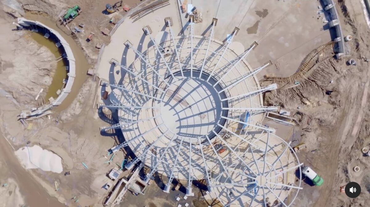 Here’s an overhead view of the two dome frameworks for the carousel. Epic Universe will have several water features and the carousel will be on the edge of one. The water will fill the concrete space in the top right part of the screenshot.