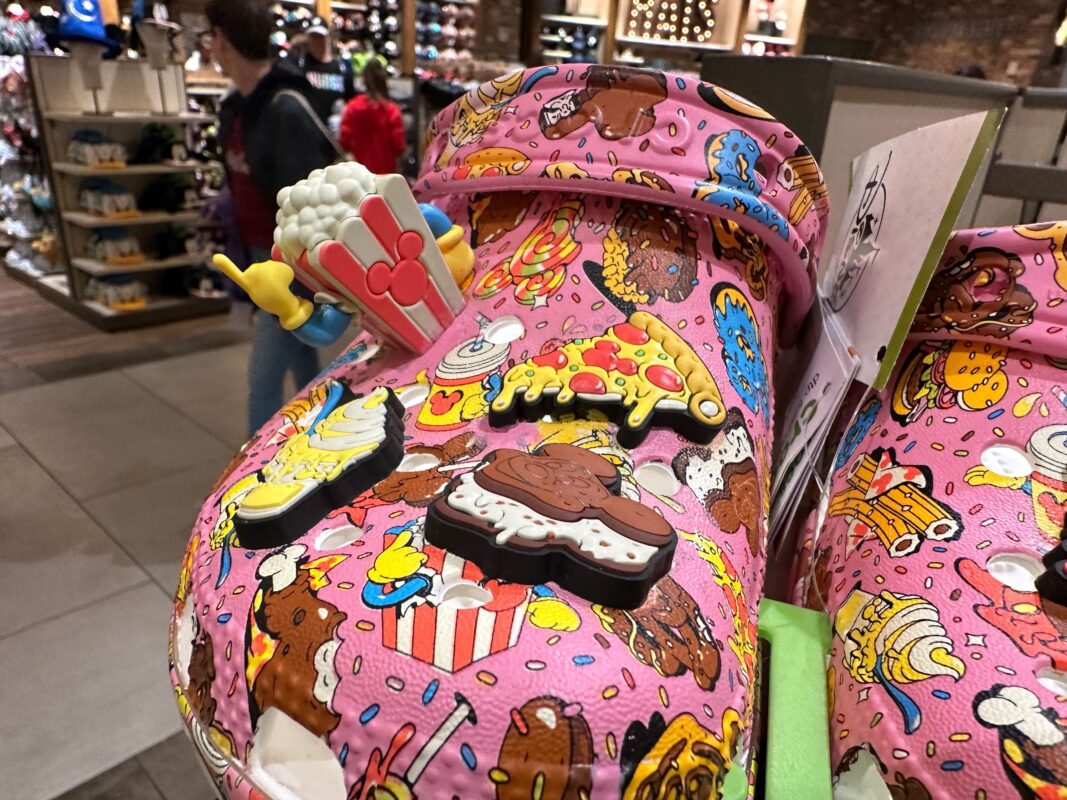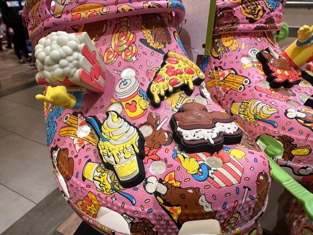 One shoe has a rubberized Jibbitz charm of a Dole Whip float, a Mickey Ice Cream Sandwich, and a slice of pizza with a hidden Mickey pepperoni slice.