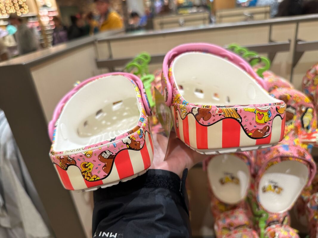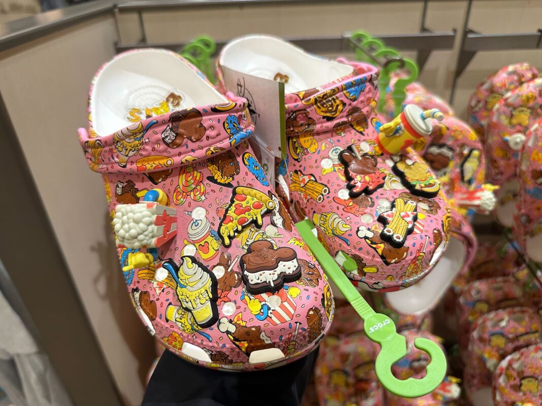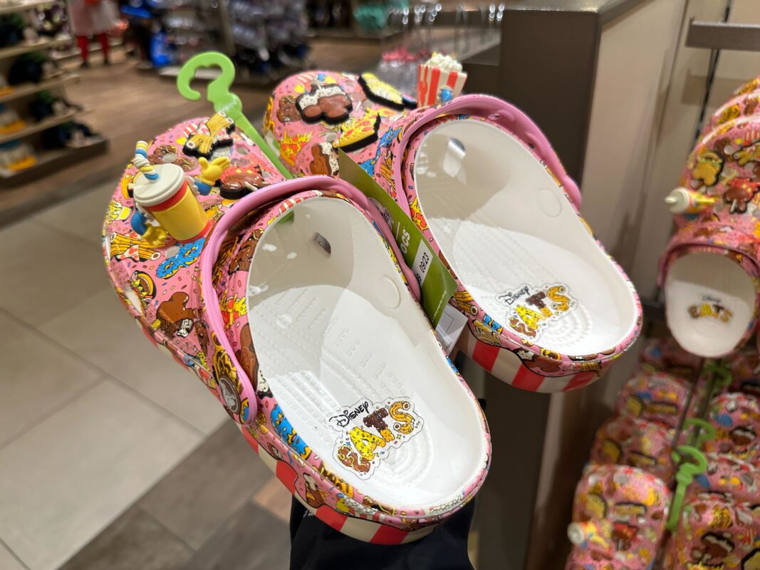 These Crocs have a busy pink all-over print of the Disney Eats design and come with several permanent Jibbitz.