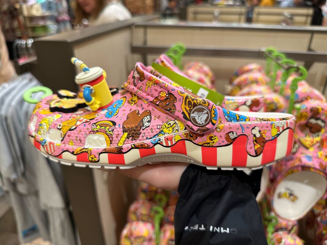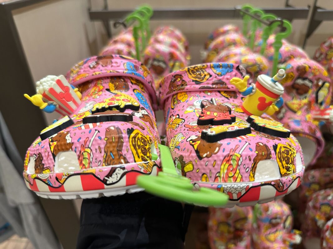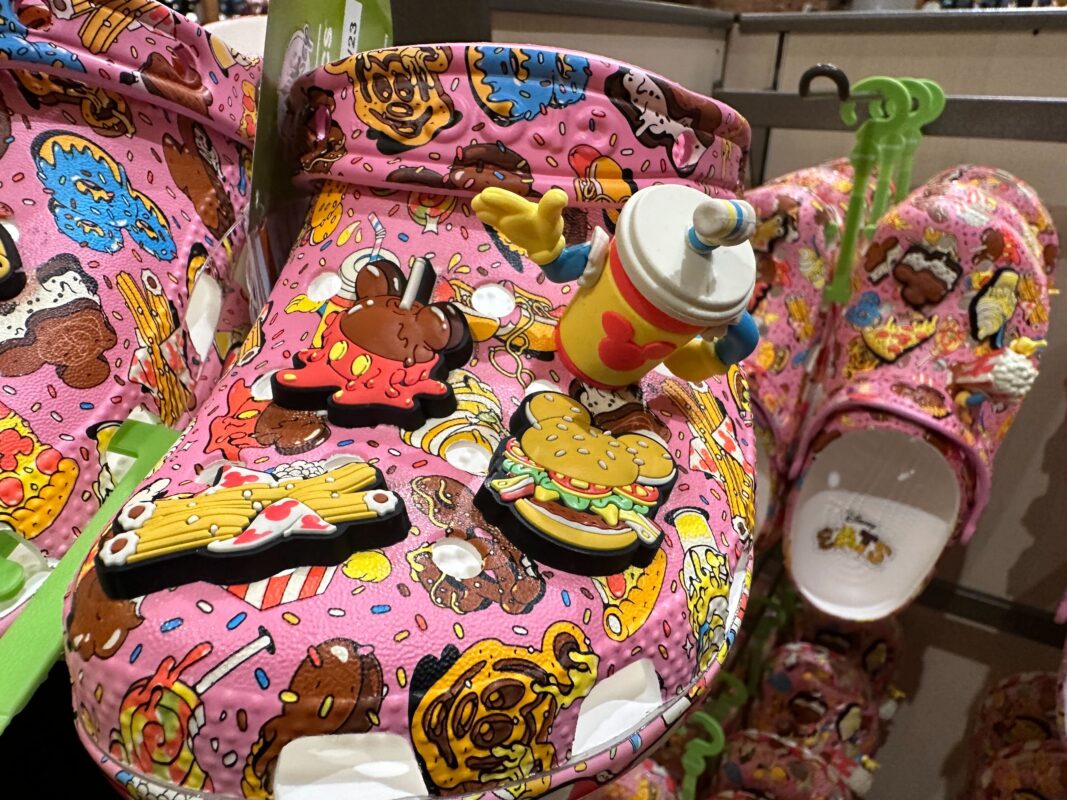 The other shoe has flat Jibbitz charms of churros, a Mickey-shaped cheeseburger, and a caramel Mickey apple. There is also a 3D charm of a drink cup with arms.