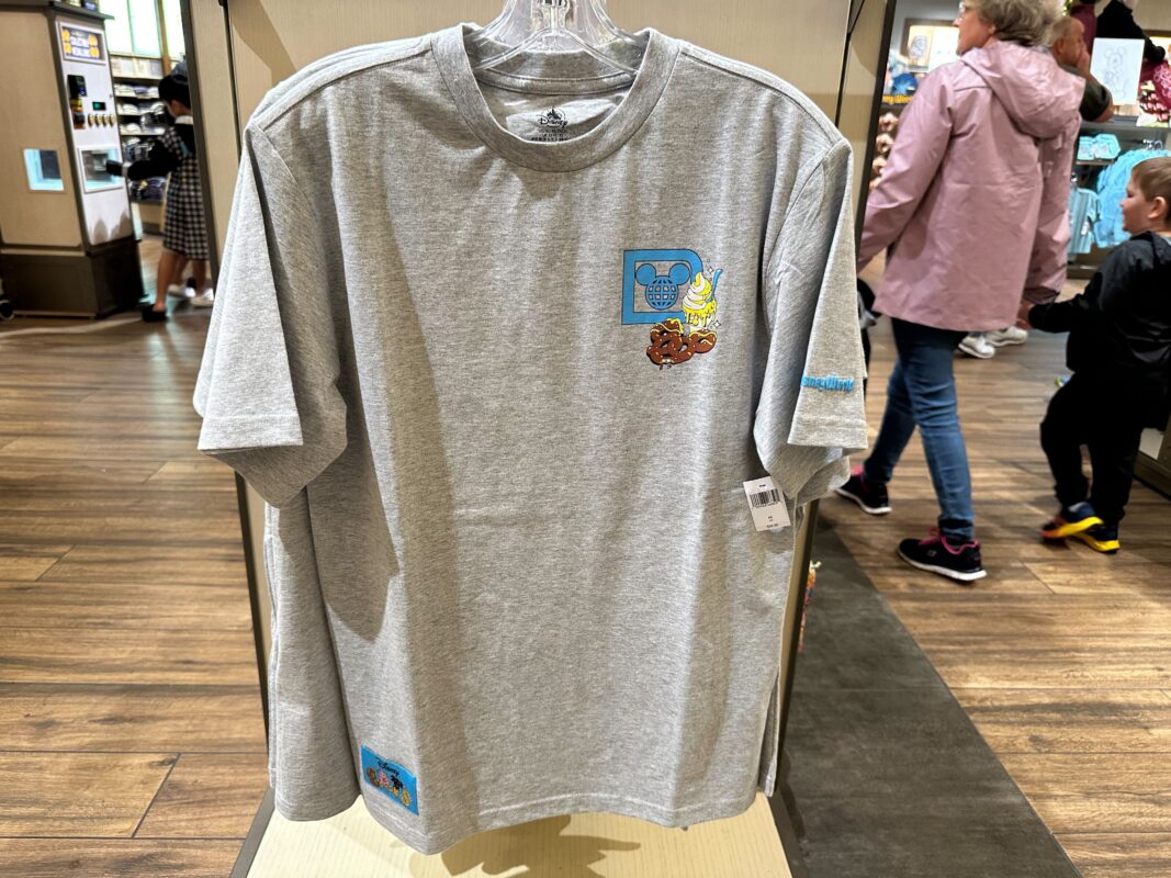 The front of the shirt has the Walt Disney World “D” logo in blue, with a Dole Whip float and a pretzel in front of it. The hem of the shirt has the collection’s blue logo tag sewn onto it.