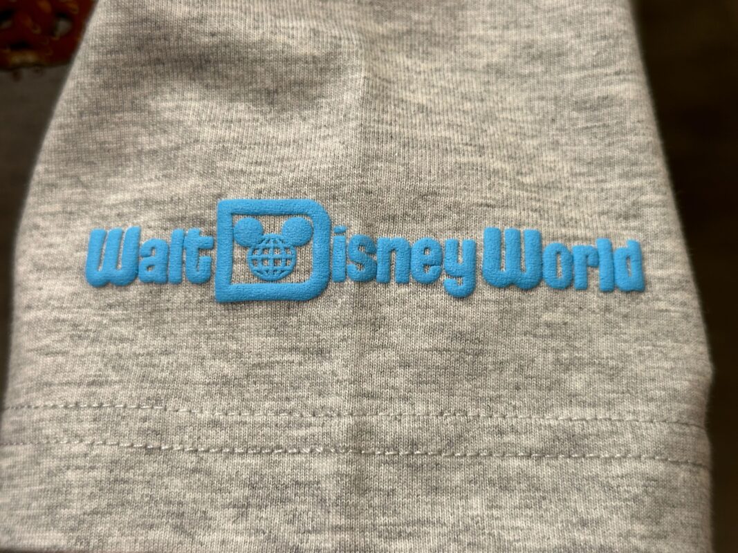 The sleeve of this shirt features the Walt Disney World wordmark in puffy blue lettering.