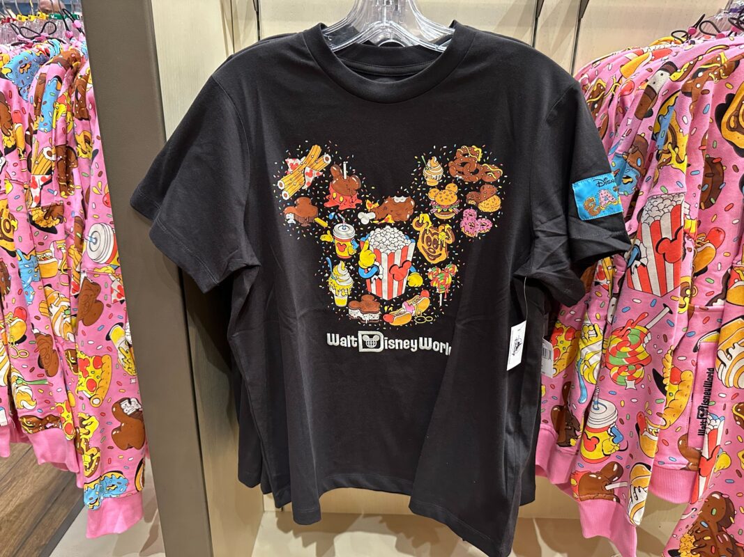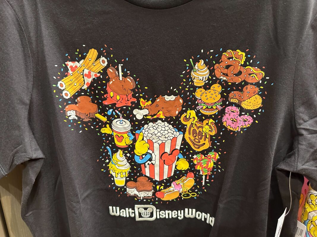 This grey shirt says “Snack Goals” printed in blue puffy lettering and has art of Disney snacks from the collection printed on the back.