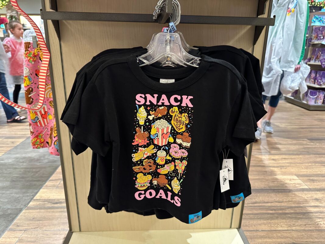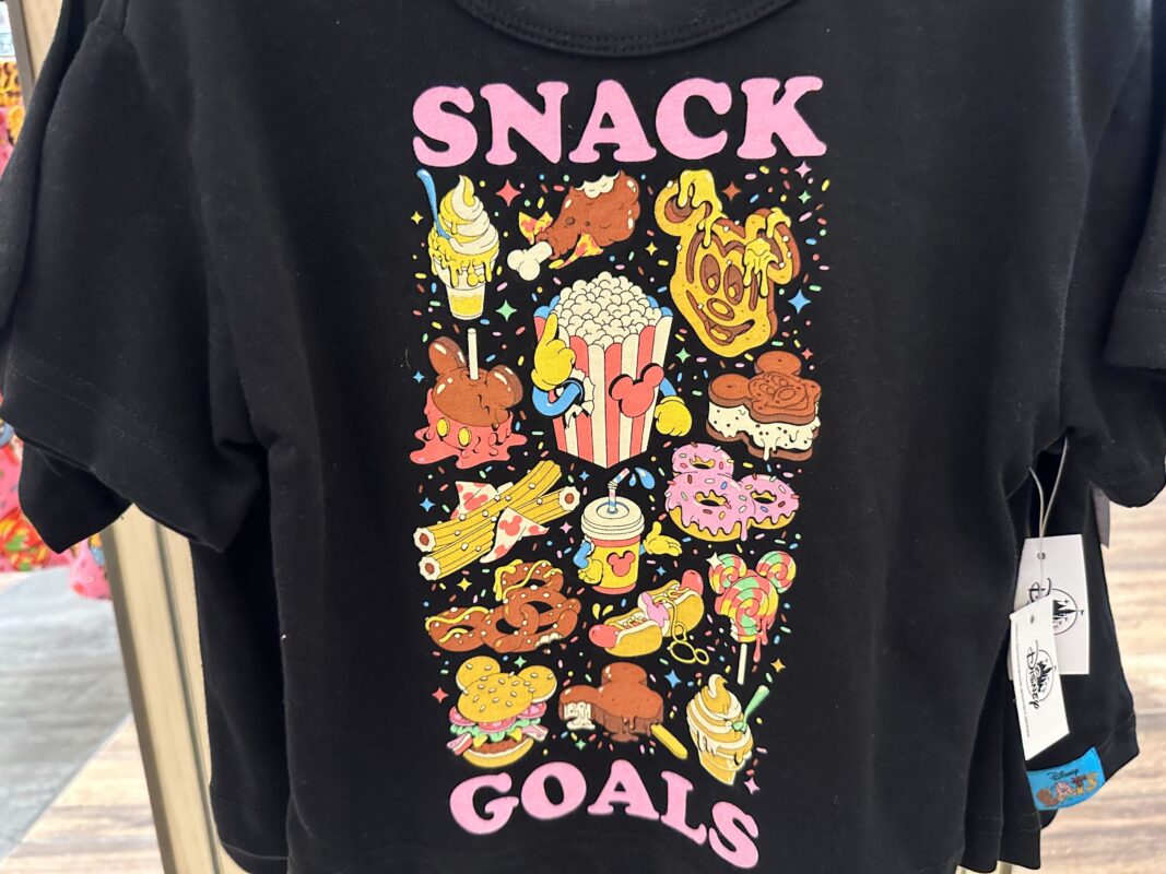 The shirt says “Snack Goals” in pink, with a variety of Disney snacks printed on the front.