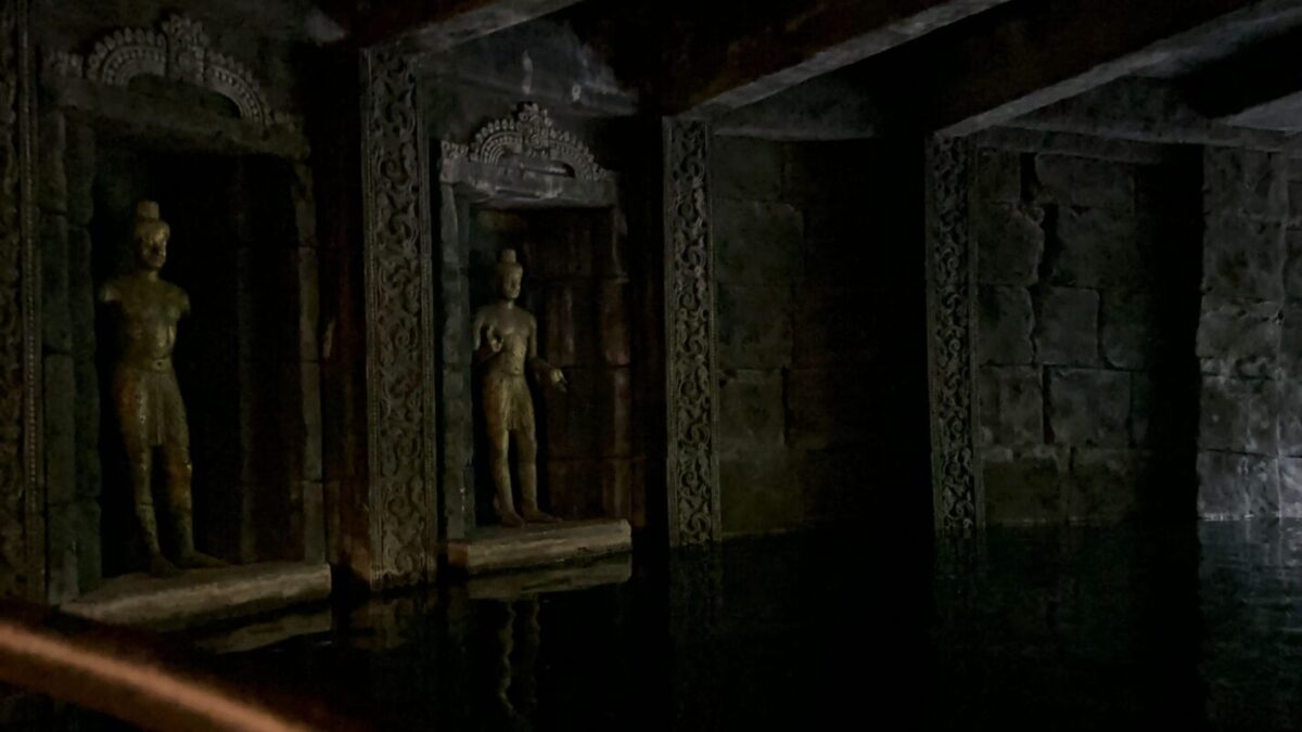 The scrim has been removed from the walls inside the temple.