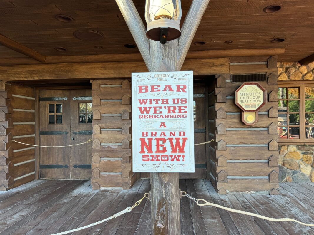 A sign teasing the new Country Bear Musical Jamboree version of the show has been installed outside the attraction.