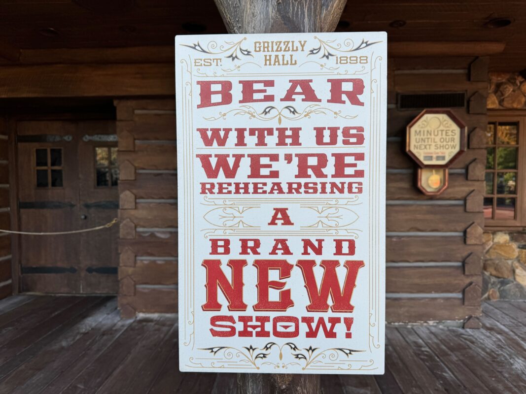 The sign reads “Bear with us. We’re rehearsing a brand new show!” with “Grizzly Hall Est. 1898” above.