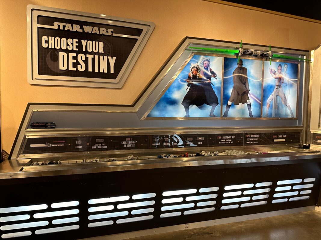 Since 2020, the characters pictured at the build-your-own lightsaber have also changed. Yoda and Luke Skywalker were swapped out for the live-action version of Ahsoka Tano portrayed by Rosario Dawson and Mace Windu portrayed by Samuel L. Jackson.