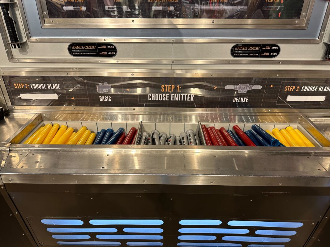 The collapsible lightsaber blades come in purple, white, green, yellow, blue, and red. There are several different emitter and hilt choices. Guests can build a single-blade lightsaber or a double-blade lightsaber (like Darth Maul). There is a deluxe emitter option that resembles Kylo Ren’s lightsaber emitter.
