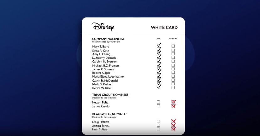The video also implores that shareholders “only vote for Disney’s 12 nominees,” and directly states “do not vote for the Trian Group or Blackwells nominees.”