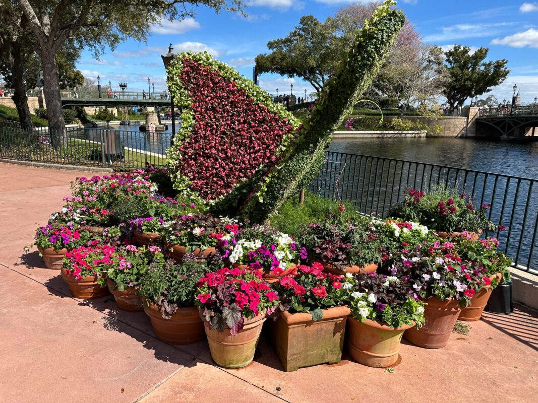 The giant butterfly topiary faces the waterway running between the International Gateway and the France Pavilion. The butterfly is surrounded by pots of pink, purple, red, and white flowers.