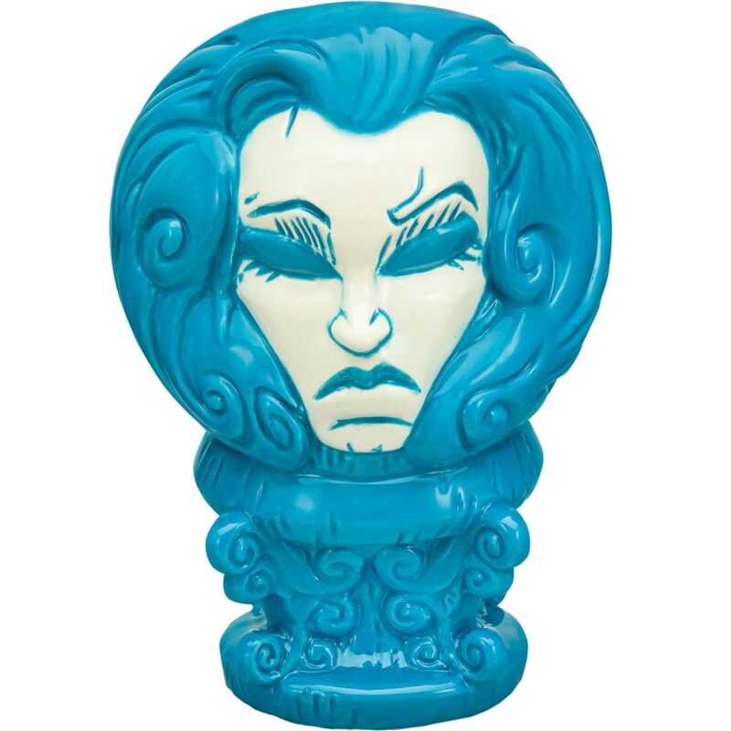 Call in the spirits… wherever they’re at with this tiki mug, featuring Madame Leota herself. Modeled after her crystal ball and stand, this blue and white tiki mug can hold 14 ounces of liquid, and is 6 1/2 inches tall by 4 1/2 inches wide.