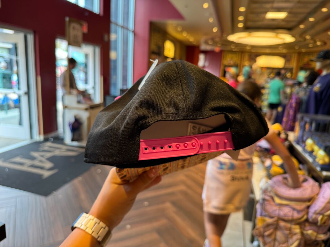 The back of the ball cap has a pink plastic adjustable strap. It is also available for purchase from the Disney Store.
