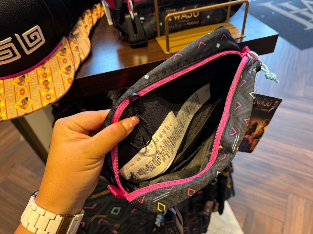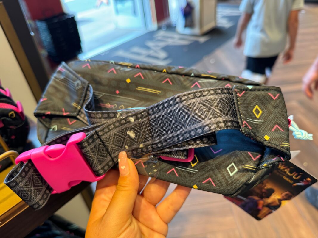 The belt bag is mainly black and dark gray, featuring the same all-over pattern as the T-shirt. It has a pink plastic zipper. It can also be found at the Disney Store.