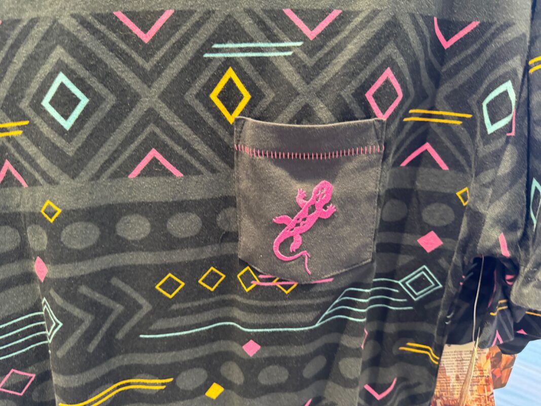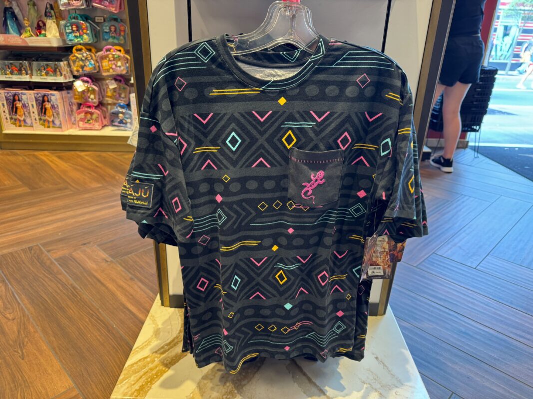 The breast pocket has exposed pink stitching. A pink lizard is also pictured on the pocket. The lizard character in the series is named Otin. This shirt is also available on shopDisney, which has rebranded back to Disney Store.